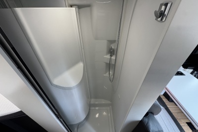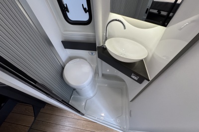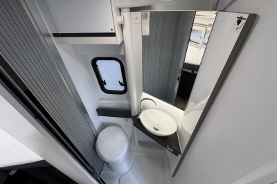 Tegenover de keuken is de natte cel met een Thetford cassettetoilet, wastafel en een volwaardige douche! De wastafel is gemonteerd op een unieke draaibare wand. Door deze te draaien wordt een prachtige douchecabine gecreëerd.