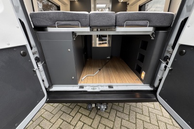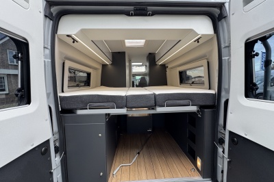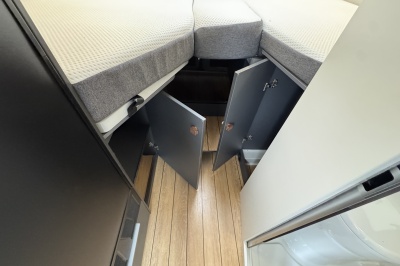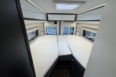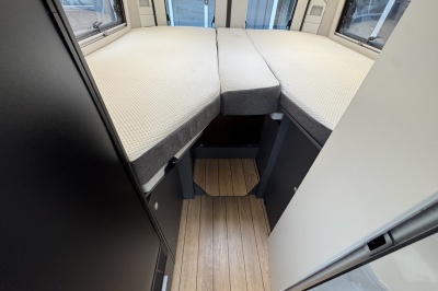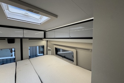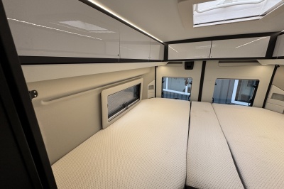 Achterin twee royale enkele bedden met een gemakkelijke instap. Boven de bedden is veel kastruimte en eronder een enorme garage en ook aparte kasten en lades. De bedden zijn eenvoudig omhoog te klappen voor een grote transportruimte.