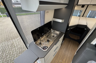 In het midden de keuken welke is uitgerust met een spoelbassin met mengkraan (warm en koud water), een koelkast met vriezer, veel kast en opbergruimte, lades met softclose en een kooktoestel spoelbassin met glasafdekking.