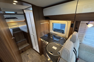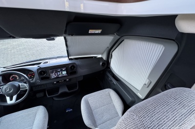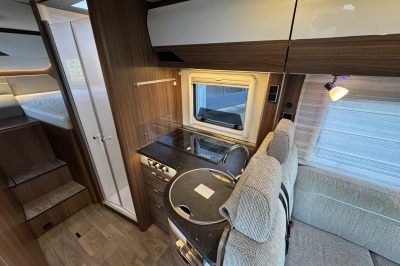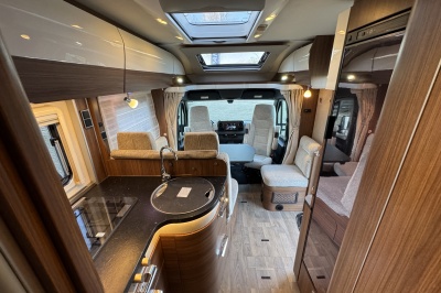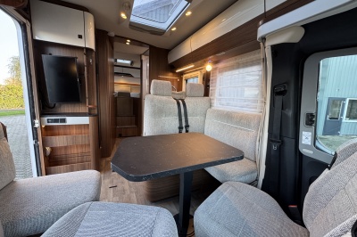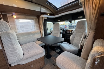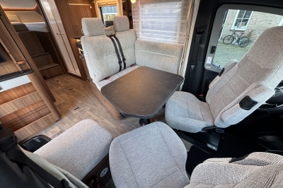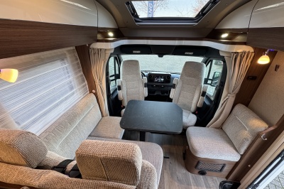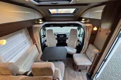 Voorin de cabine staan 2 comfortstoelen welke volledig draai- en verstelbaar zijn. Daarachter een royale L-zit met langsbank biedt een gezellige en een ruime zitgroep.