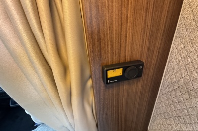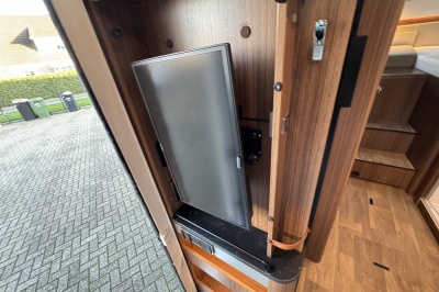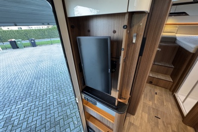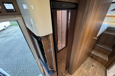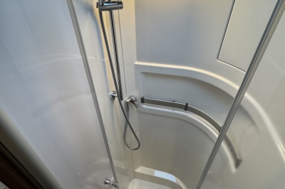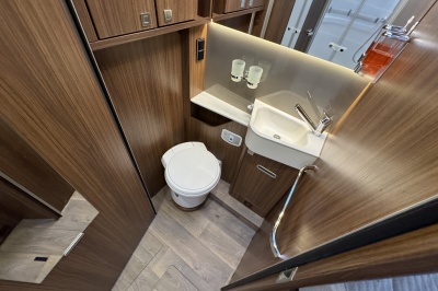 Voor de bedden is de toiletruimte gesitueerd met een cassettetoilet, wastafel en toiletkast. Aan de andere zijde is een volwaardige douchecabine. Door de deur van het toilet helemaal te openen kunt u het woongedeelte scheiden van het toilet / slaapgedeelte.