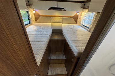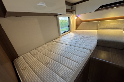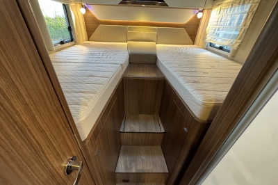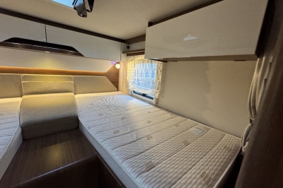 Achterin twee royale enkele bedden met een gemakkelijke instap. De bedden zijn middels een tussenstuk ook samen te voegen tot één bed. Onder de bedden is veel kastruimte en een grote XL garage.