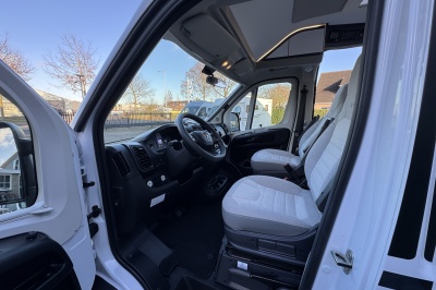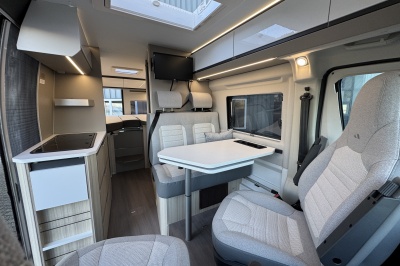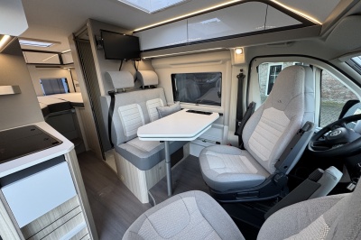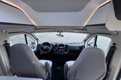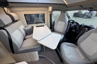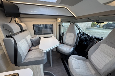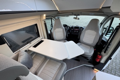 Voorin de cabine twee luxe draai-, verstel- en kantelbare comfortstoelen met armleuning. Achter de voorstoelen is een brede twee persoons bank met verschuifbare tafel.