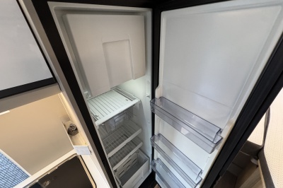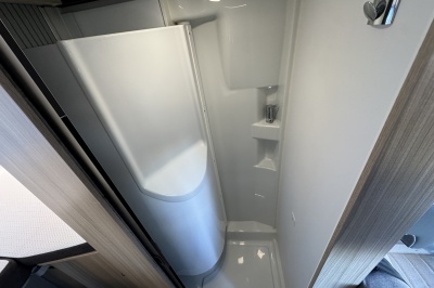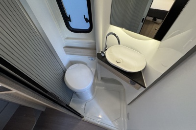 Tegenover de keuken is de natte cel met een Thetford cassettetoilet, wastafel en een volwaardige douche! De wastafel is gemonteerd op een unieke draaibare wand. Door deze te draaien wordt een prachtige douchecabine gecreëerd.