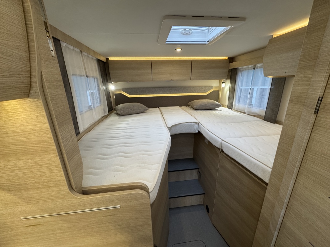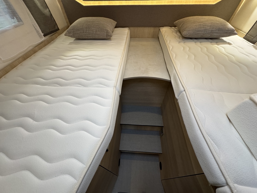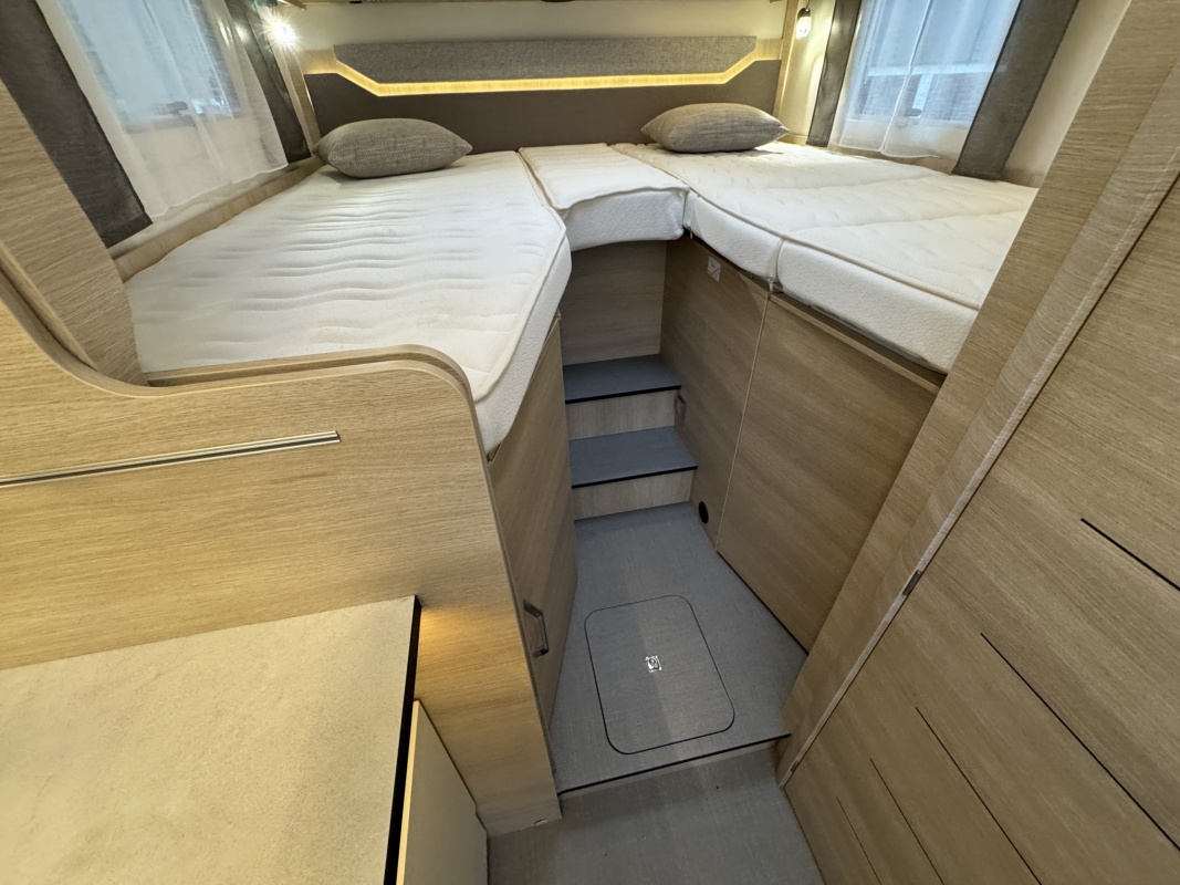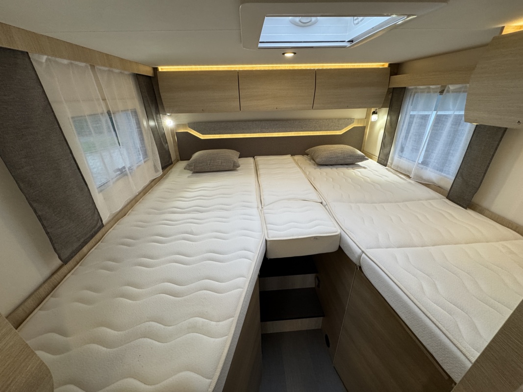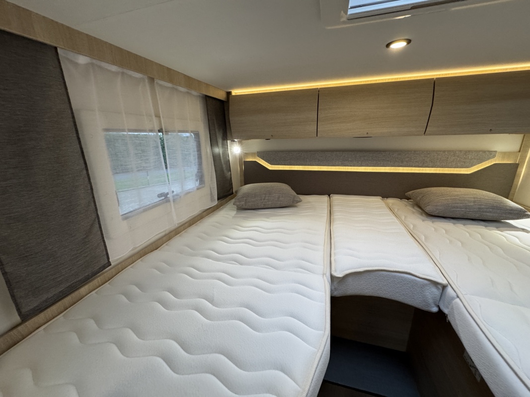 Achterin twee royale lengte bedden met een dikke en comfortabele matras. De bedden hebben een gemakkelijke instap en zijn ook samen te voegen tot één groot bed! Onder de bedden is veel kastruimte en een grote XXL Garage.