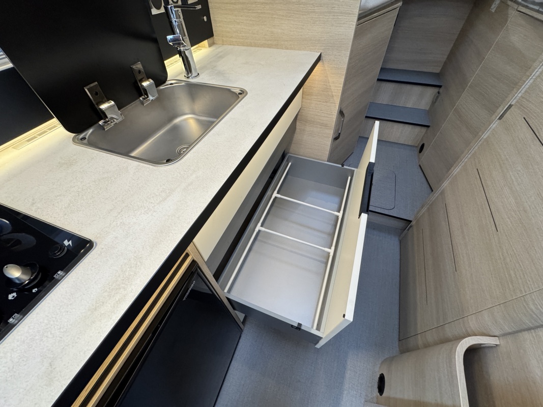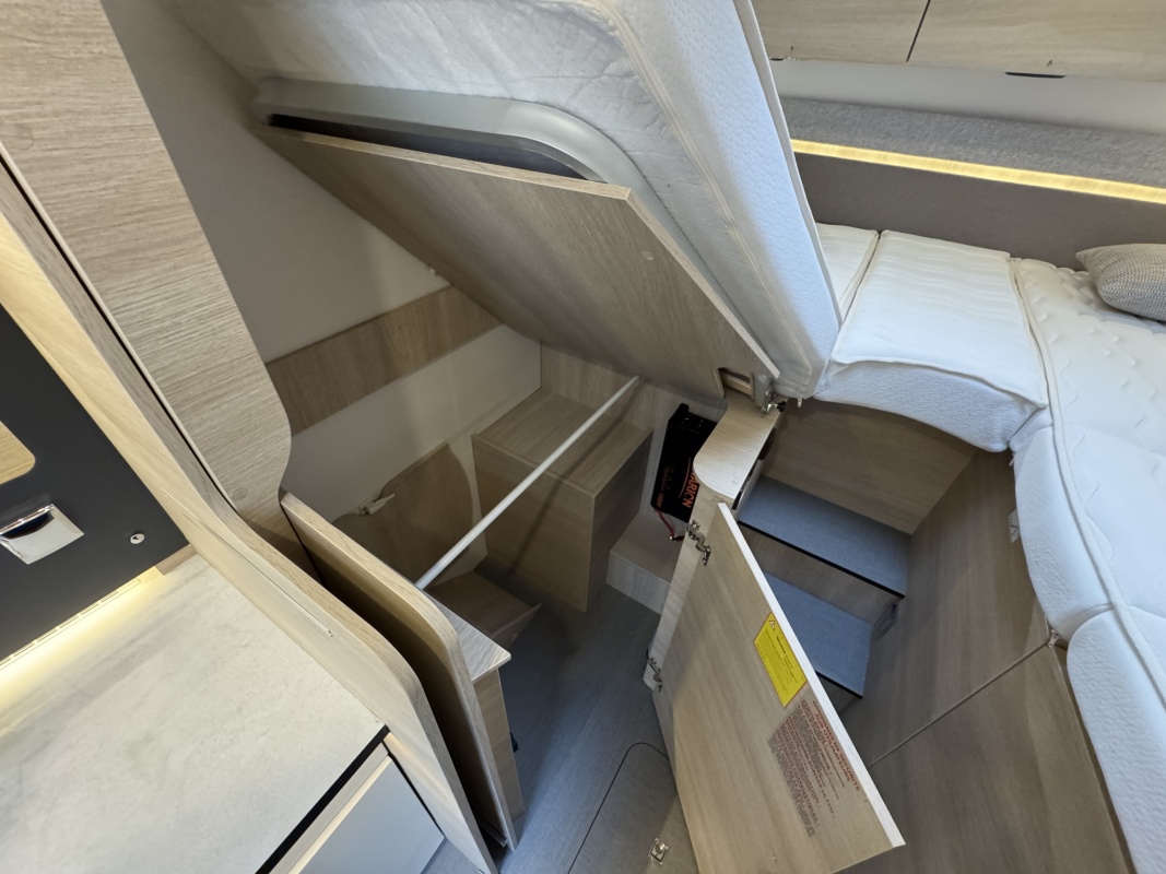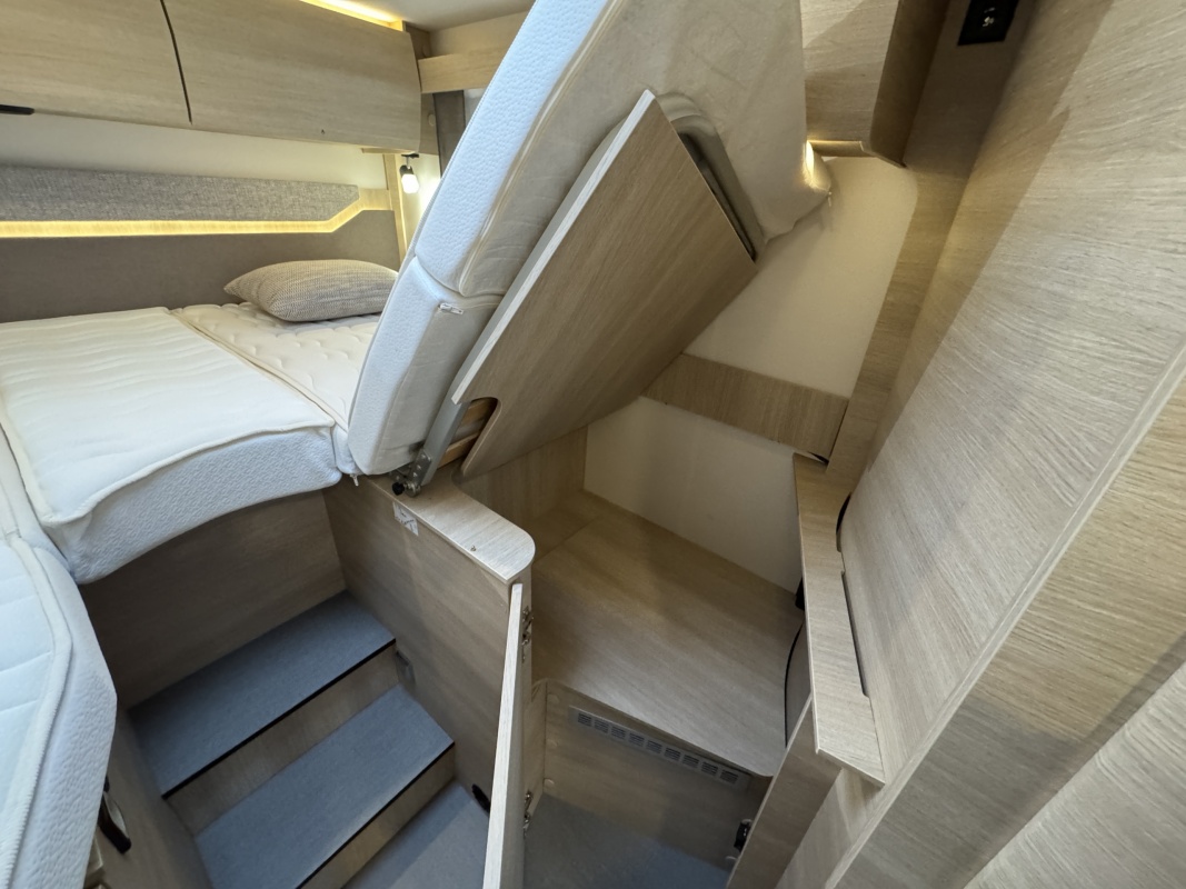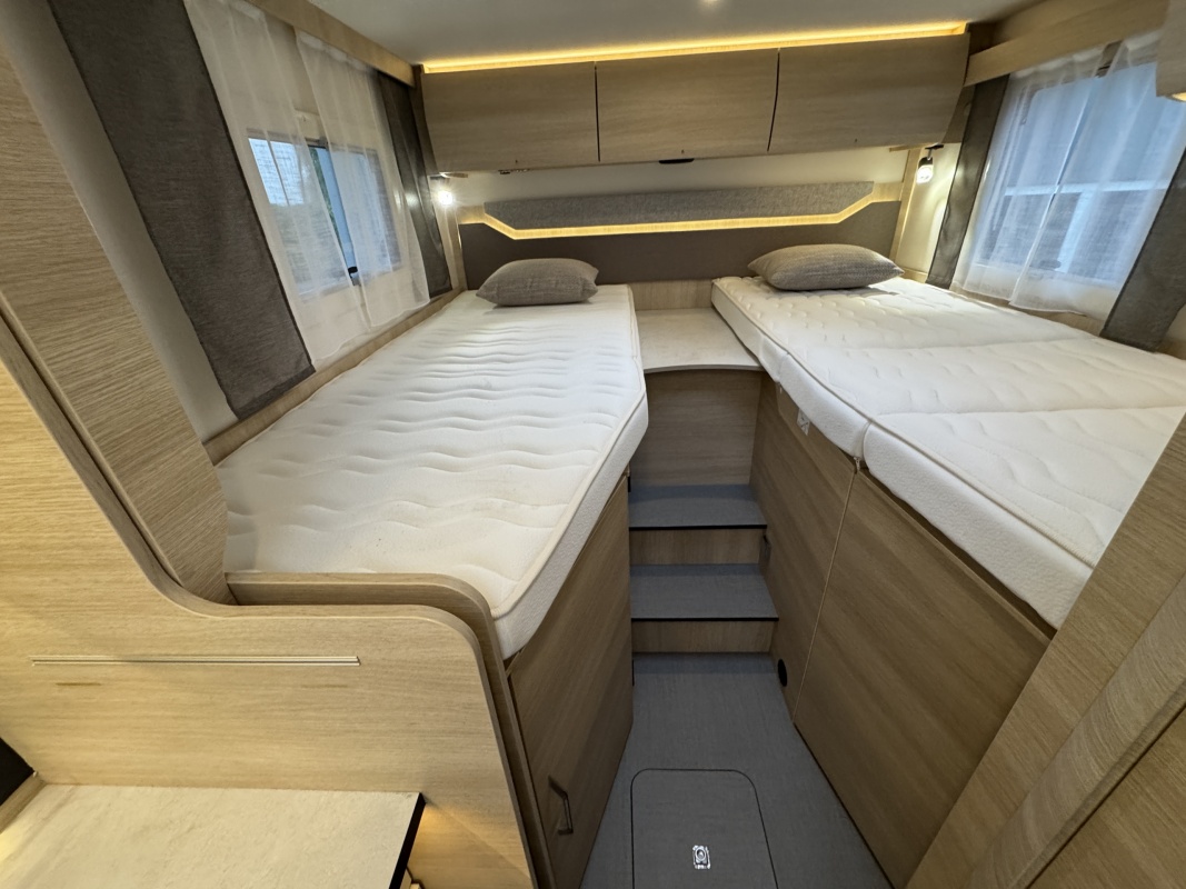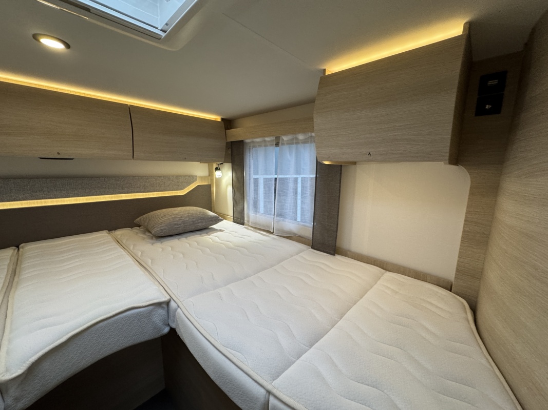 Achterin twee royale lengte bedden met een dikke en comfortabele matras. De bedden hebben een gemakkelijke instap en zijn ook samen te voegen tot één groot bed! Onder de bedden is veel kastruimte en een grote XXL Garage.