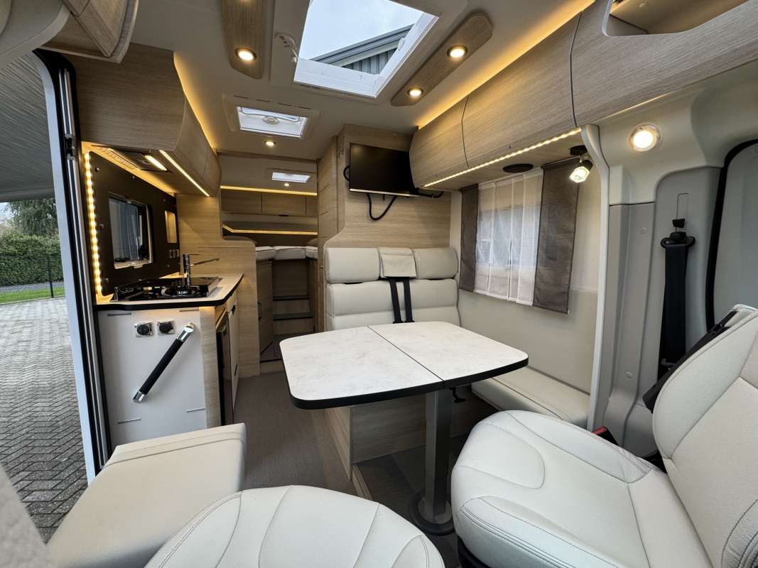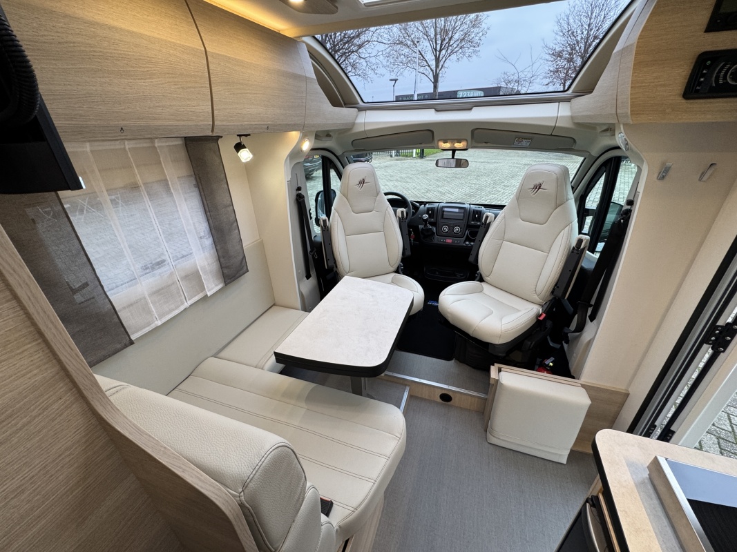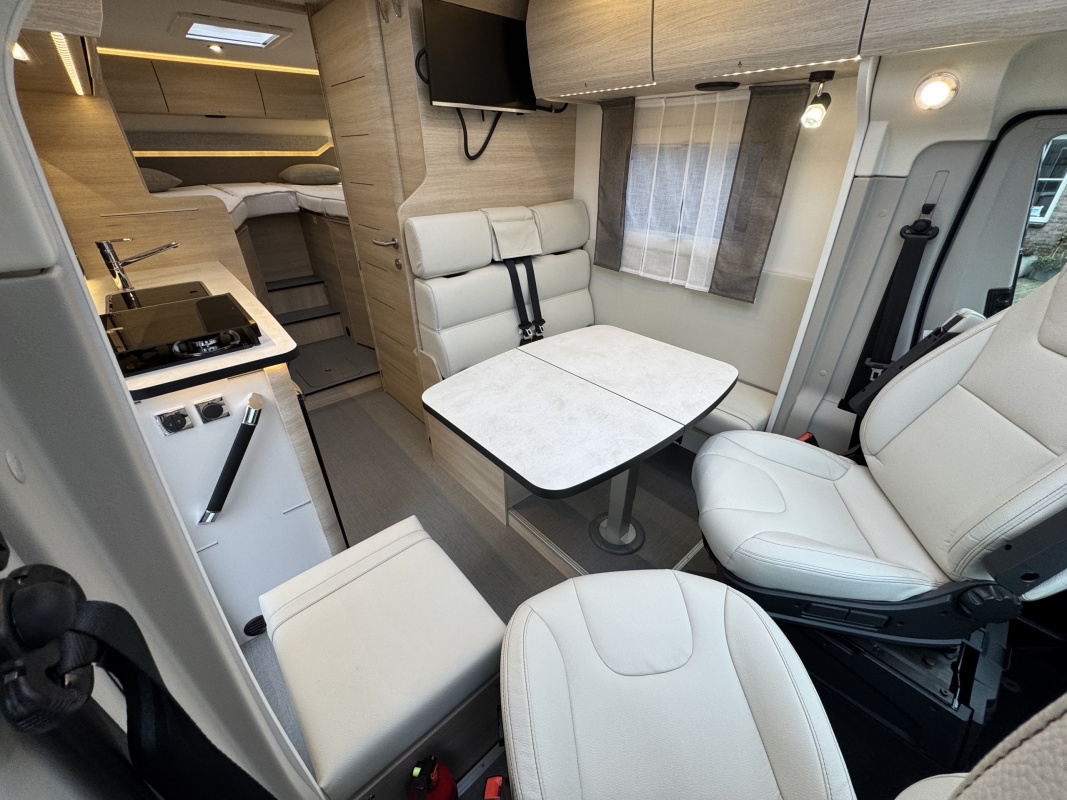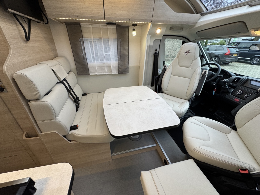 Voorin de cabine 2 comfortstoelen welke draai-, verstel- en kantelbaar zijn met armleuning. Daarachter een L-zit en bij de ingang is een wegklapbare zijzitbank (voetenbankje). De zitgroep kan ook worden omgelegd tot een extra bed (zie foto's).