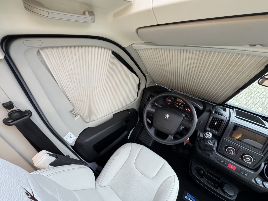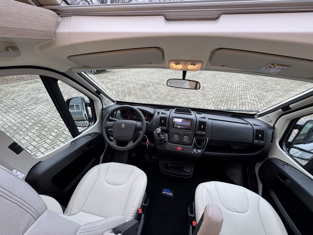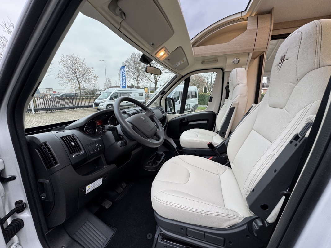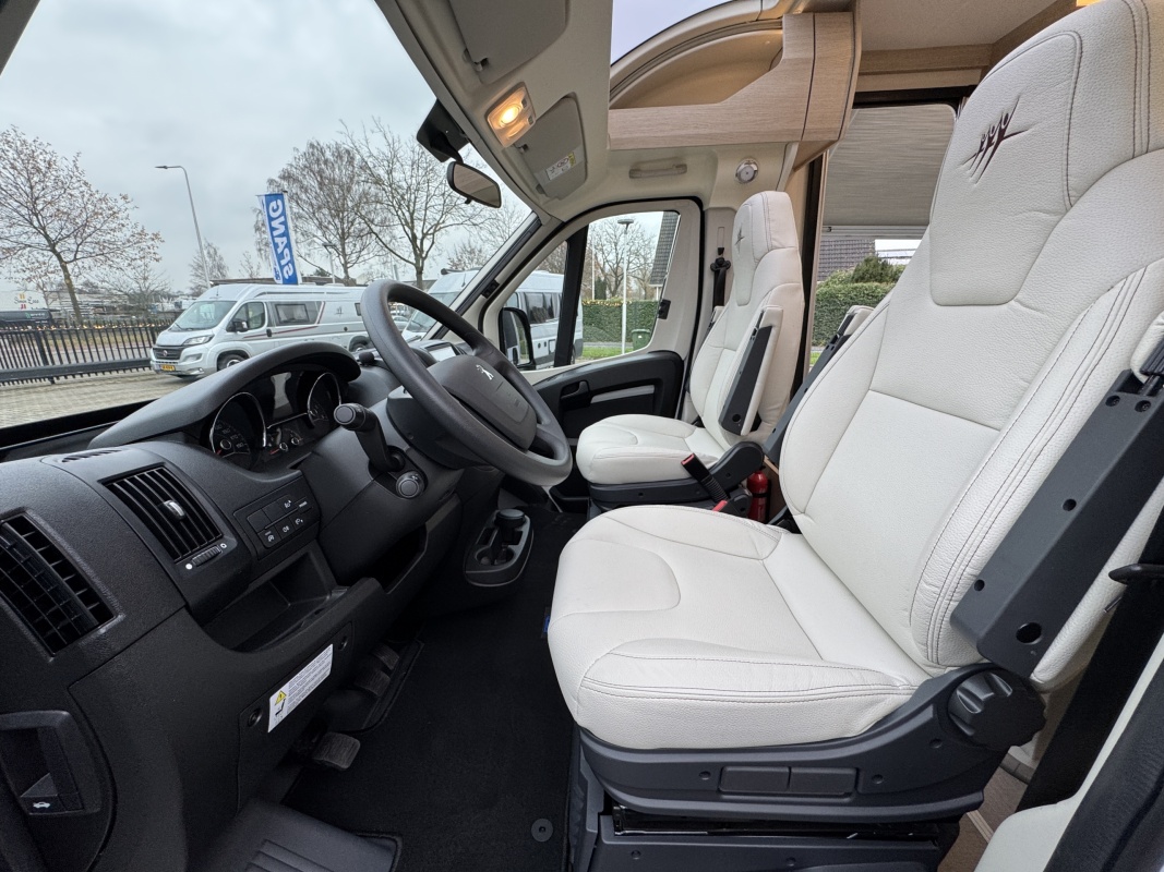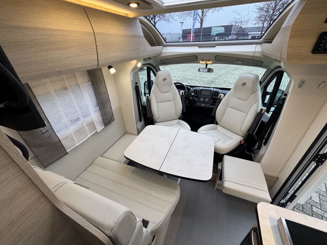 Voorin de cabine 2 comfortstoelen welke draai-, verstel- en kantelbaar zijn met armleuning. Daarachter een L-zit en bij de ingang is een wegklapbare zijzitbank (voetenbankje). De zitgroep kan ook worden omgelegd tot een extra bed (zie foto's).