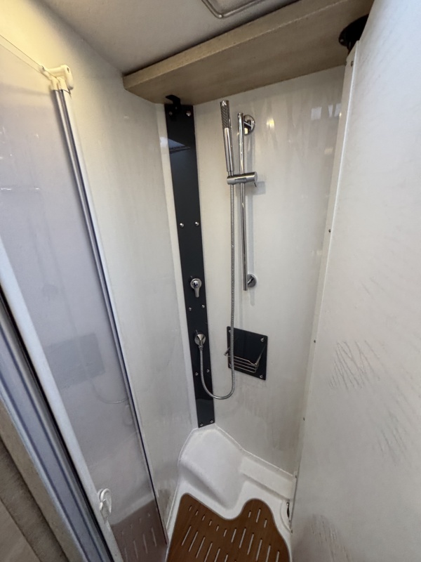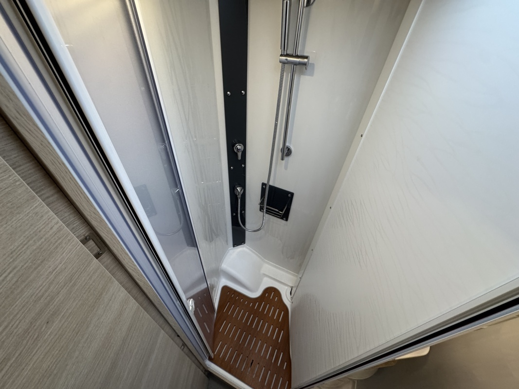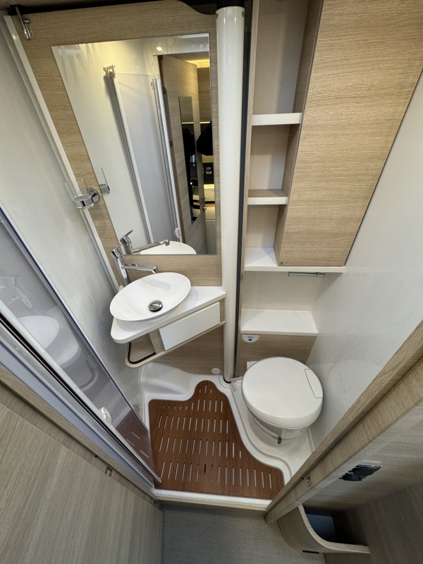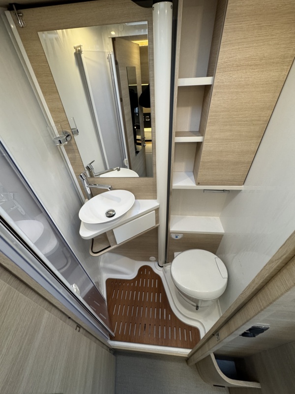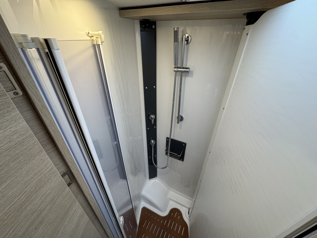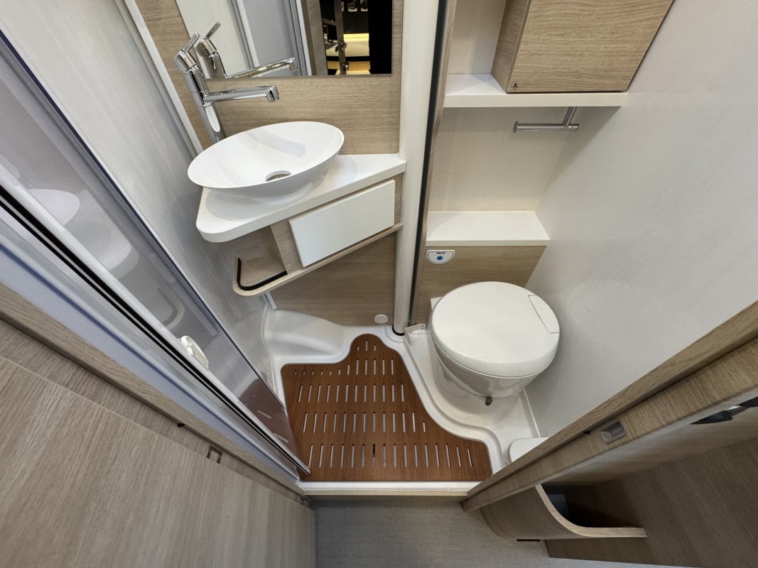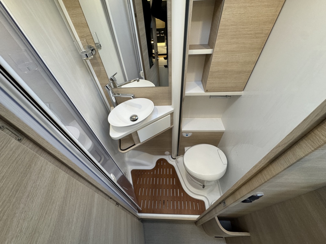 Tegenover de keuken de badkamer met een cassettetoilet, een wastafel met toiletkast gemonteerd op een DUO'Space wand waardoor de wastafel is weg te draaien en er een volwaardige douchecabine ontstaat!