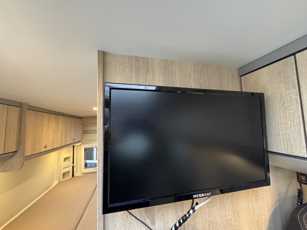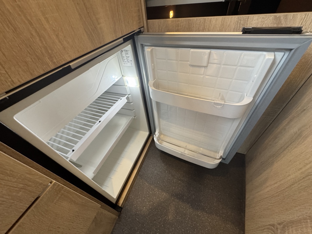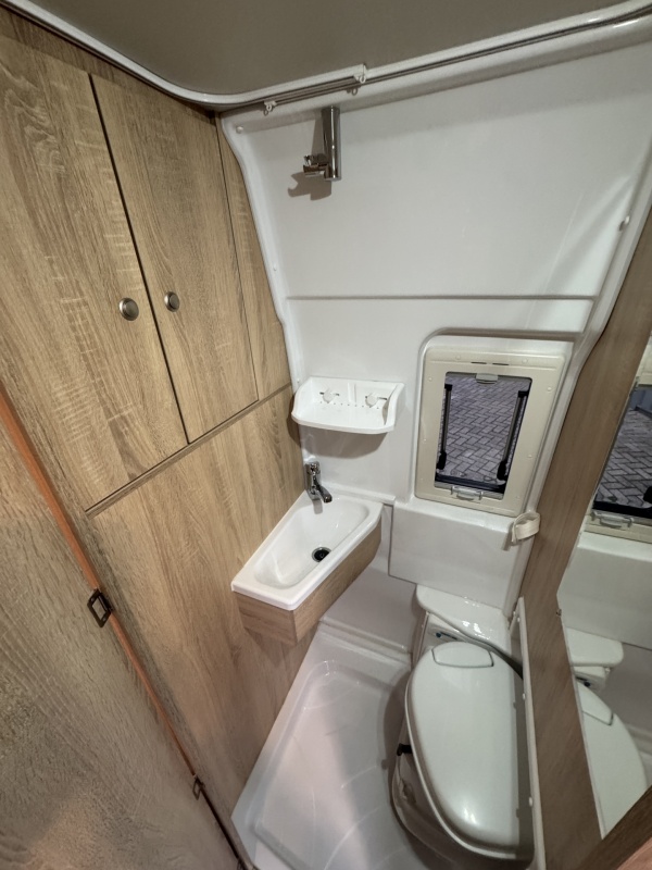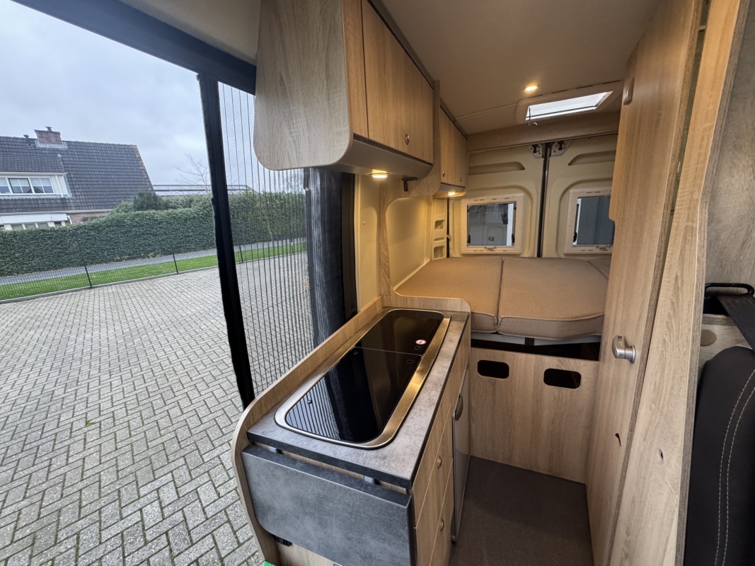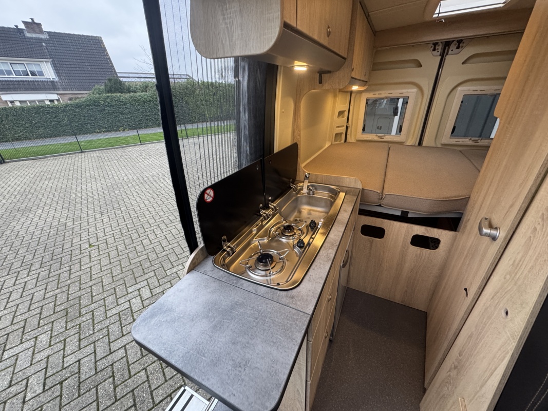 In het midden zit de keuken welke is uitgerust met een spoelbassin met mengkraan, een kooktoestel met glasafdekking, een koelkast met vriesvak en veel kast en opbergruimte. Tegenover de keuken is de natte cel met een Thetford cassettetoilet, een wastafel en de mogelijkheid om te douchen.