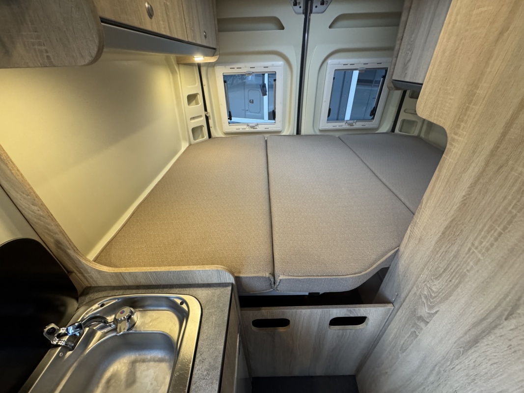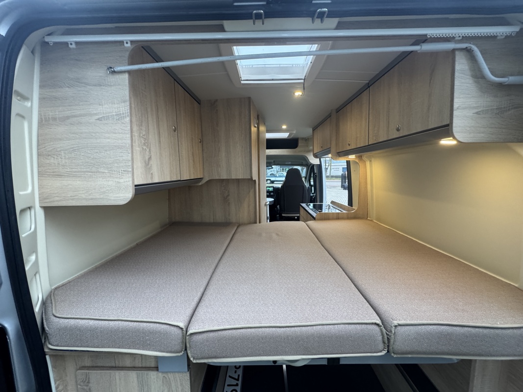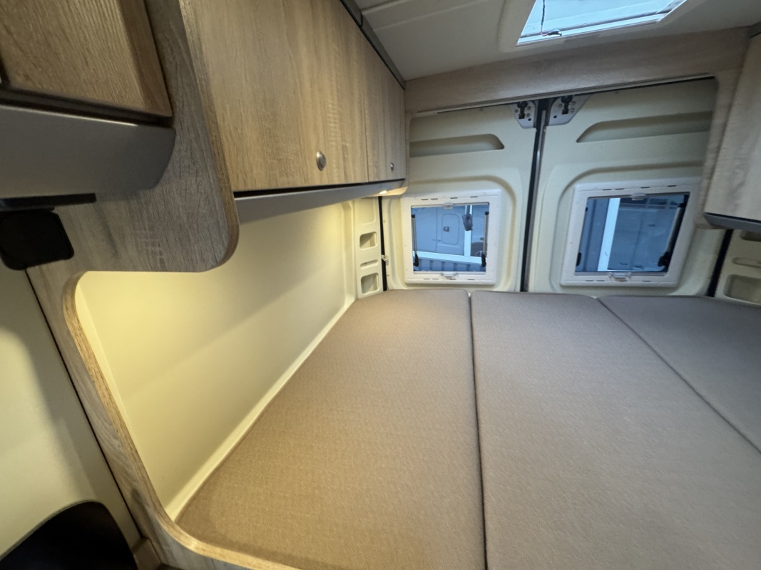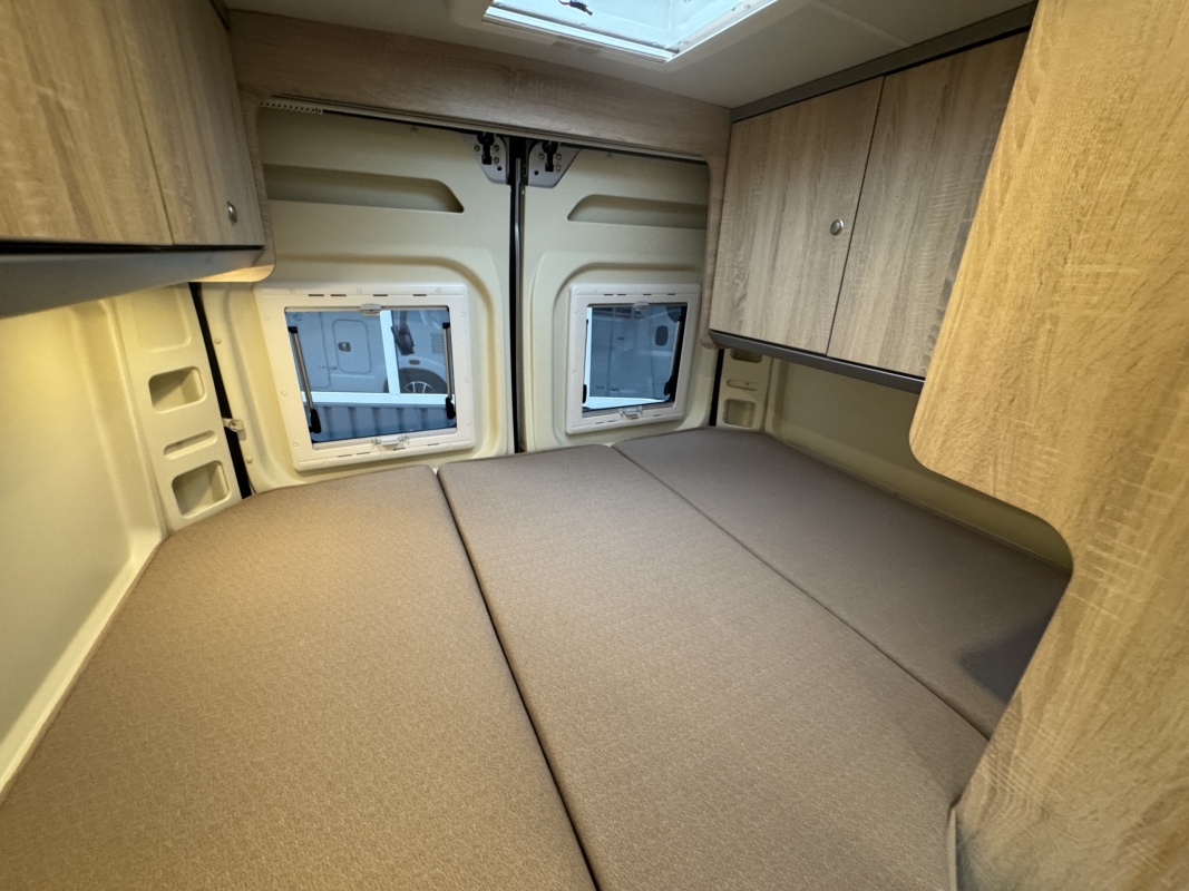 Achterin een groot twee persoons dwarsbed met een gemakkelijke instap en een grote garage / opbergruimte onder het bed.
