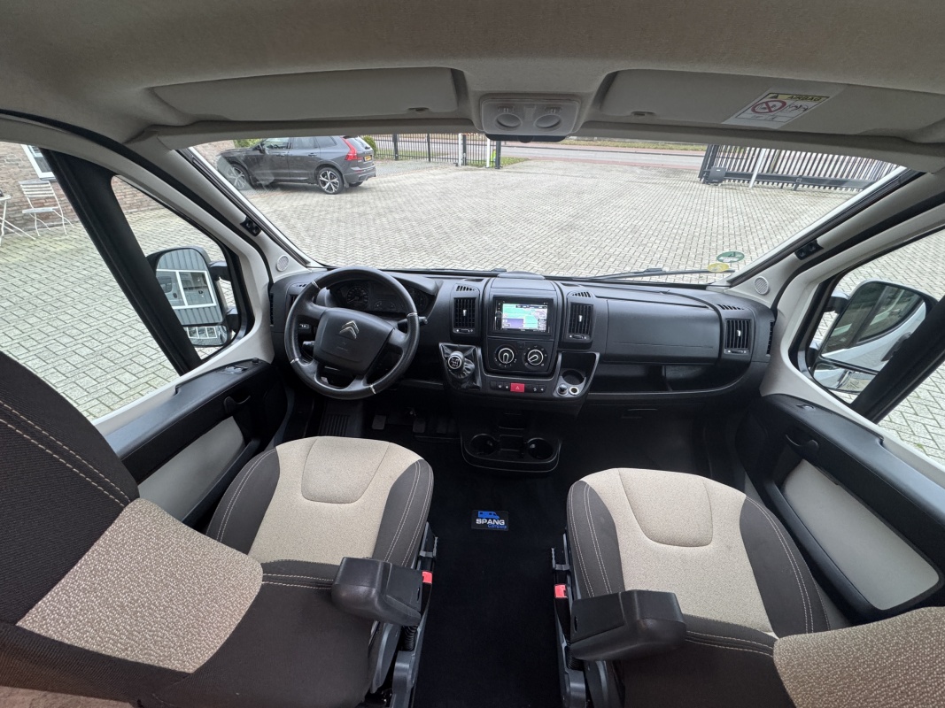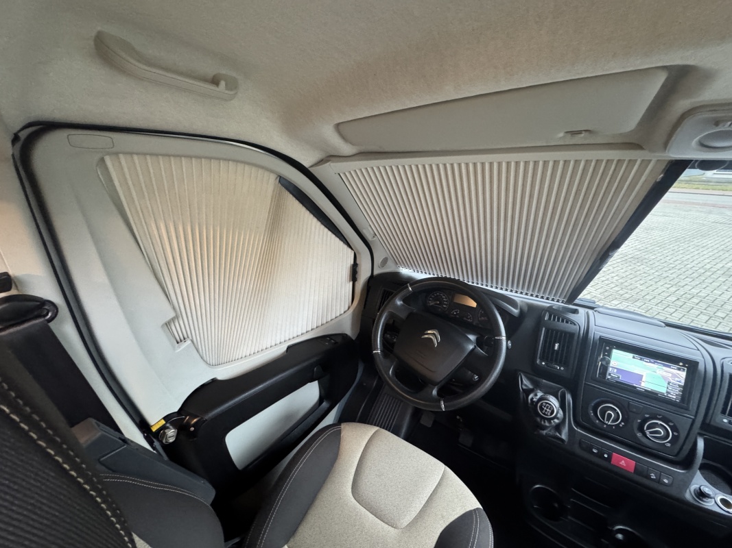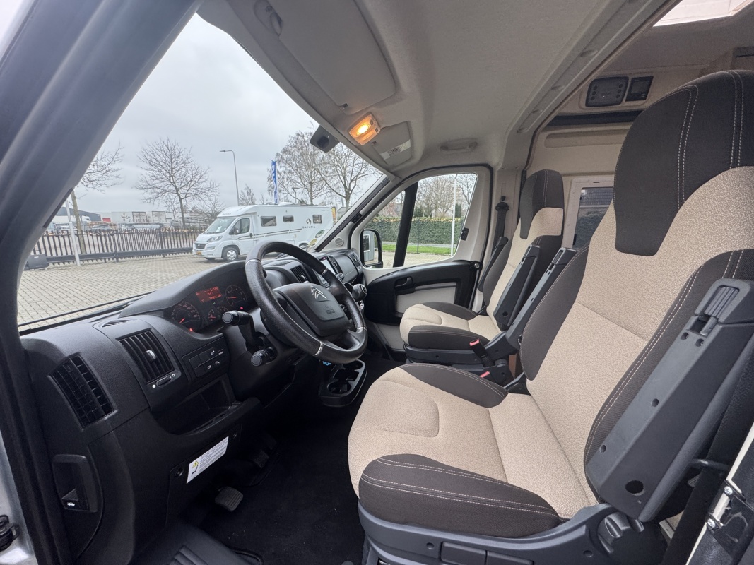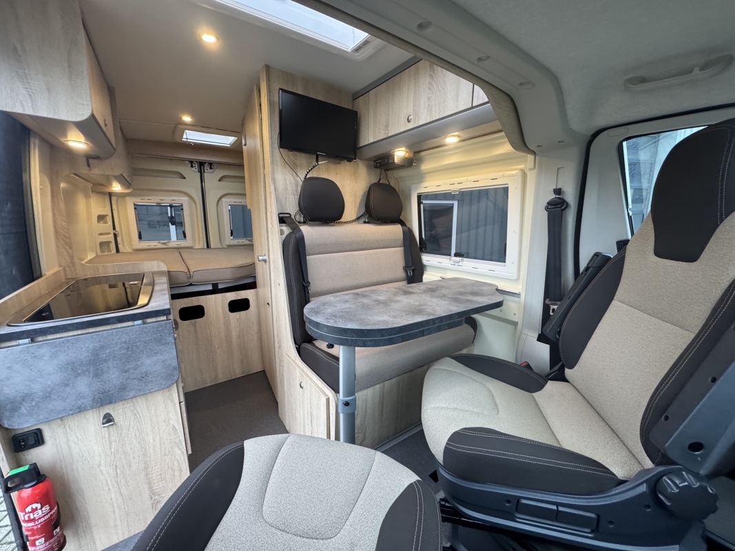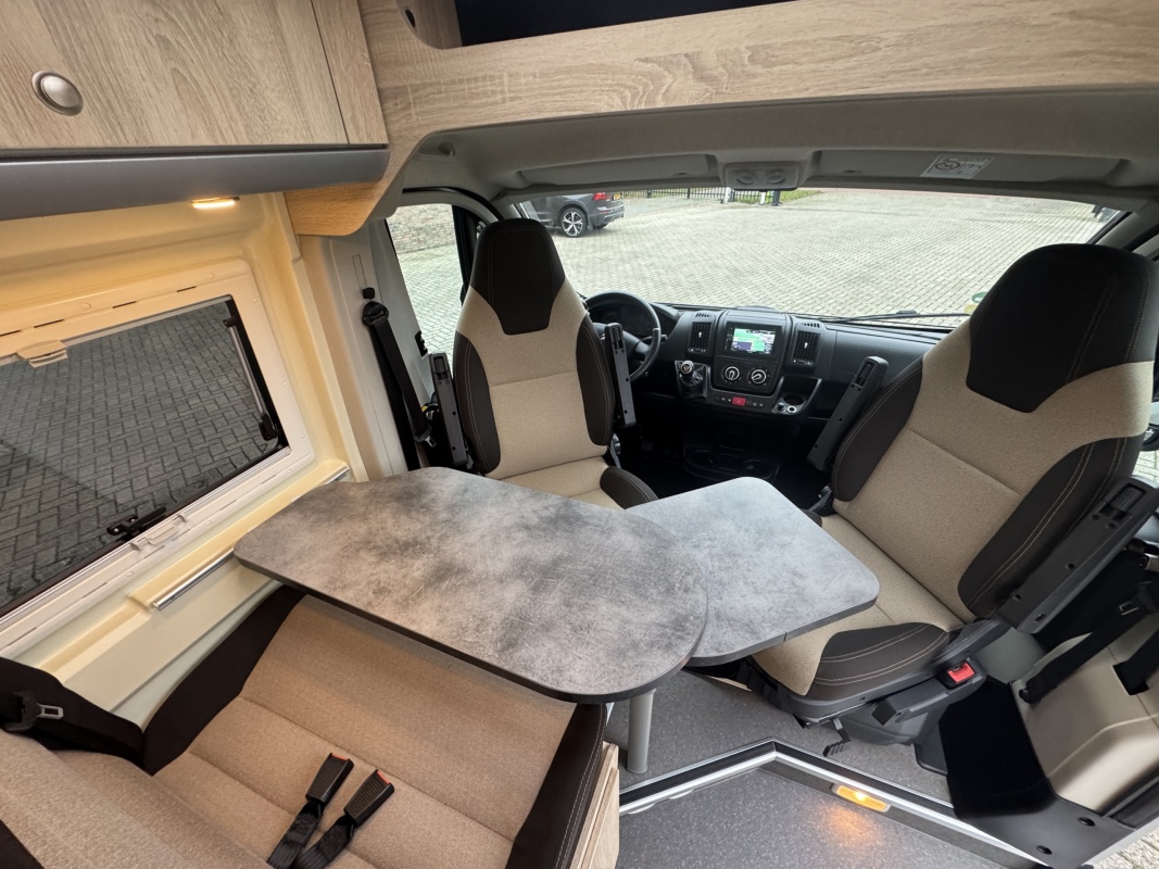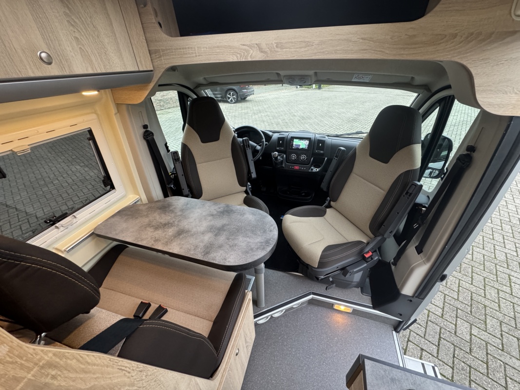 Voorin de cabine staan twee draai-, verstel- en kantelbare comfortstoelen, daarachter een dinettebank met een tafel waarvan een verborgen deel te draaien is naar de bijrijdersstoel.