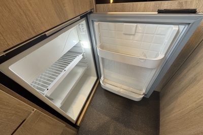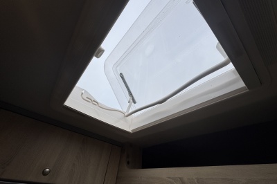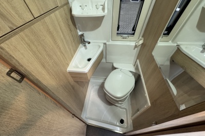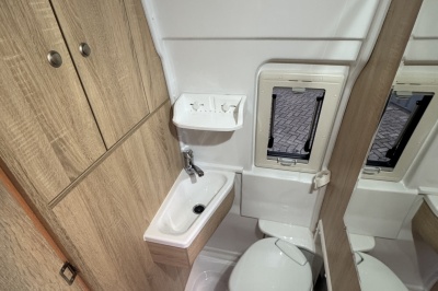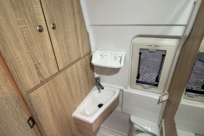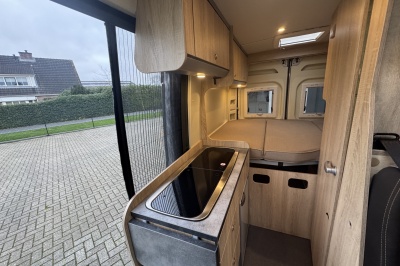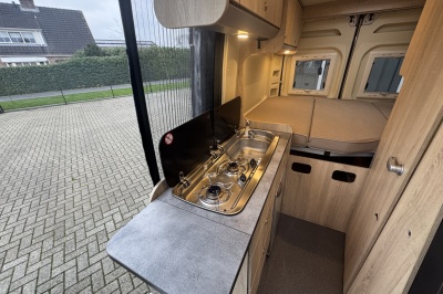 In het midden zit de keuken welke is uitgerust met een spoelbassin met mengkraan, een kooktoestel met glasafdekking, een koelkast met vriesvak en veel kast en opbergruimte. Tegenover de keuken is de natte cel met een Thetford cassettetoilet, een wastafel en de mogelijkheid om te douchen.