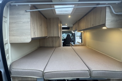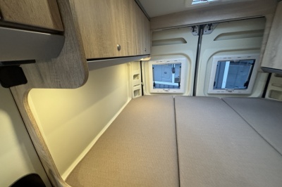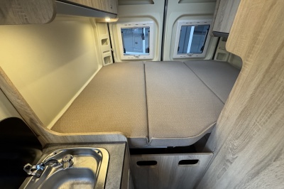 Achterin een groot twee persoons dwarsbed met een gemakkelijke instap en een grote garage / opbergruimte onder het bed.