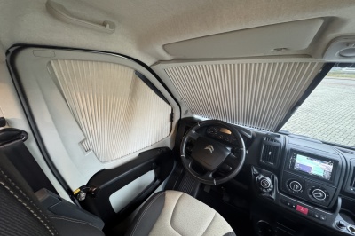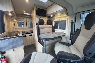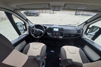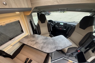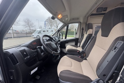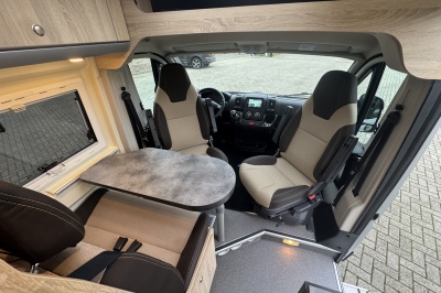 Voorin de cabine staan twee draai-, verstel- en kantelbare comfortstoelen, daarachter een dinettebank met een tafel waarvan een verborgen deel te draaien is naar de bijrijdersstoel.
