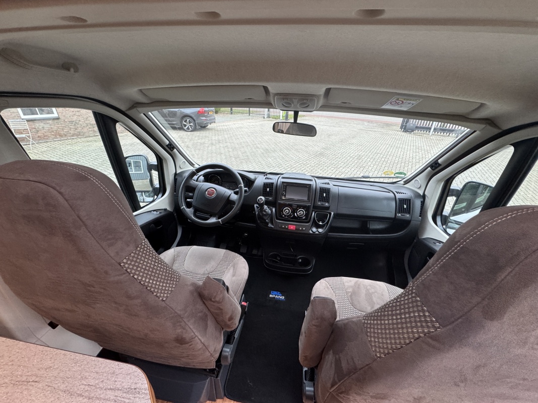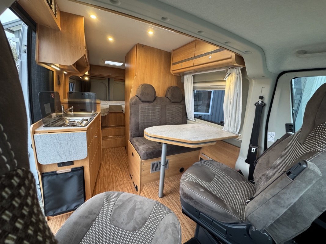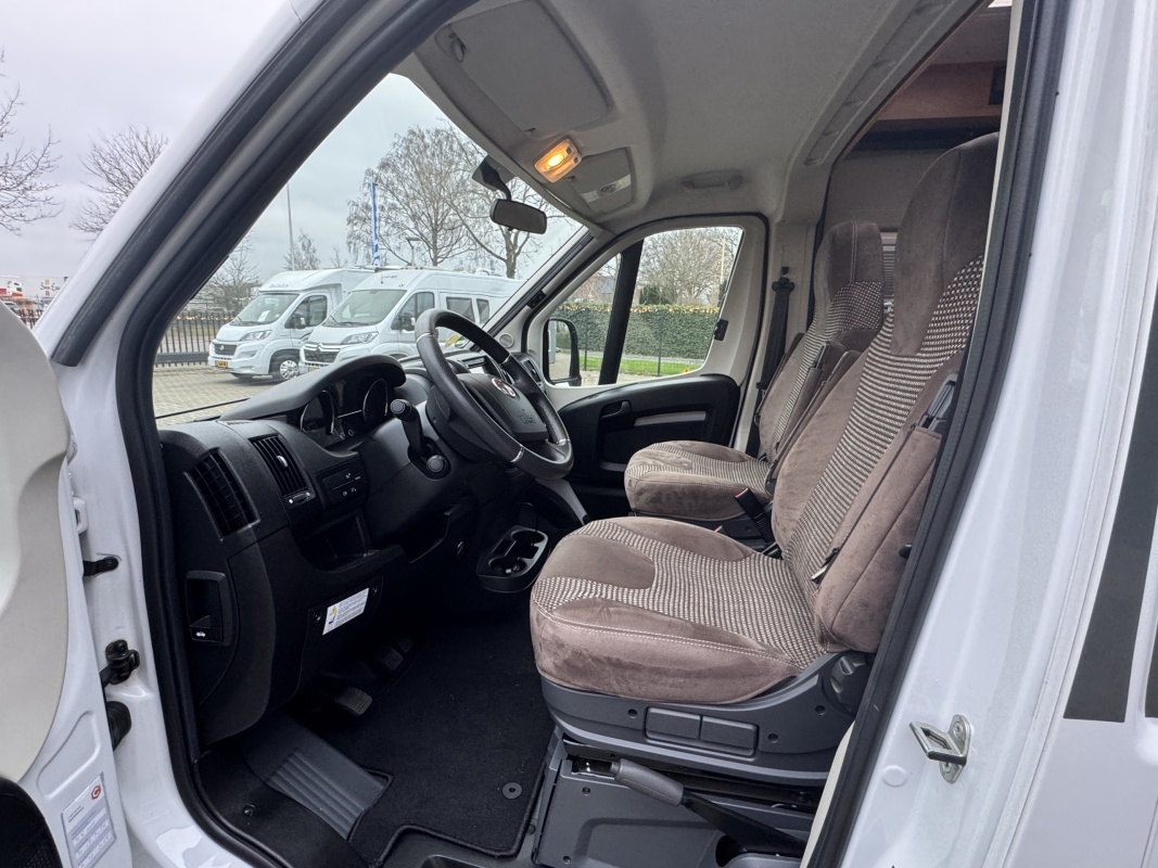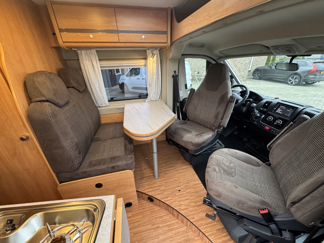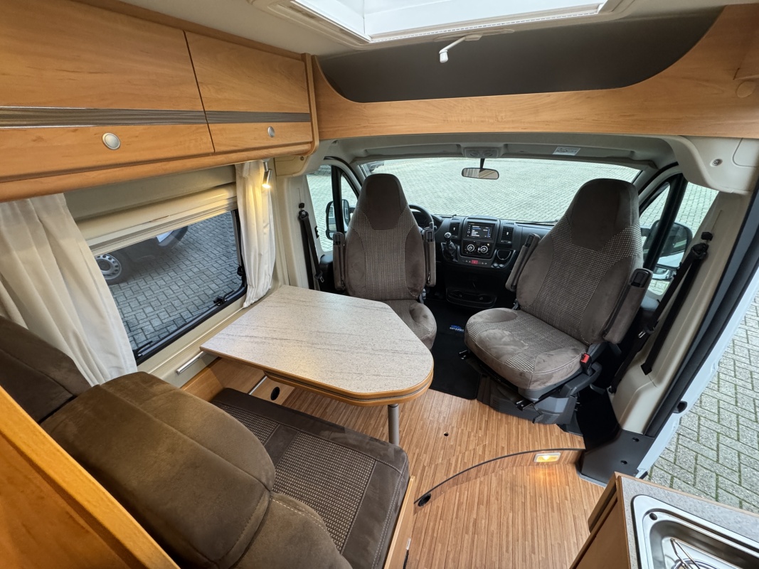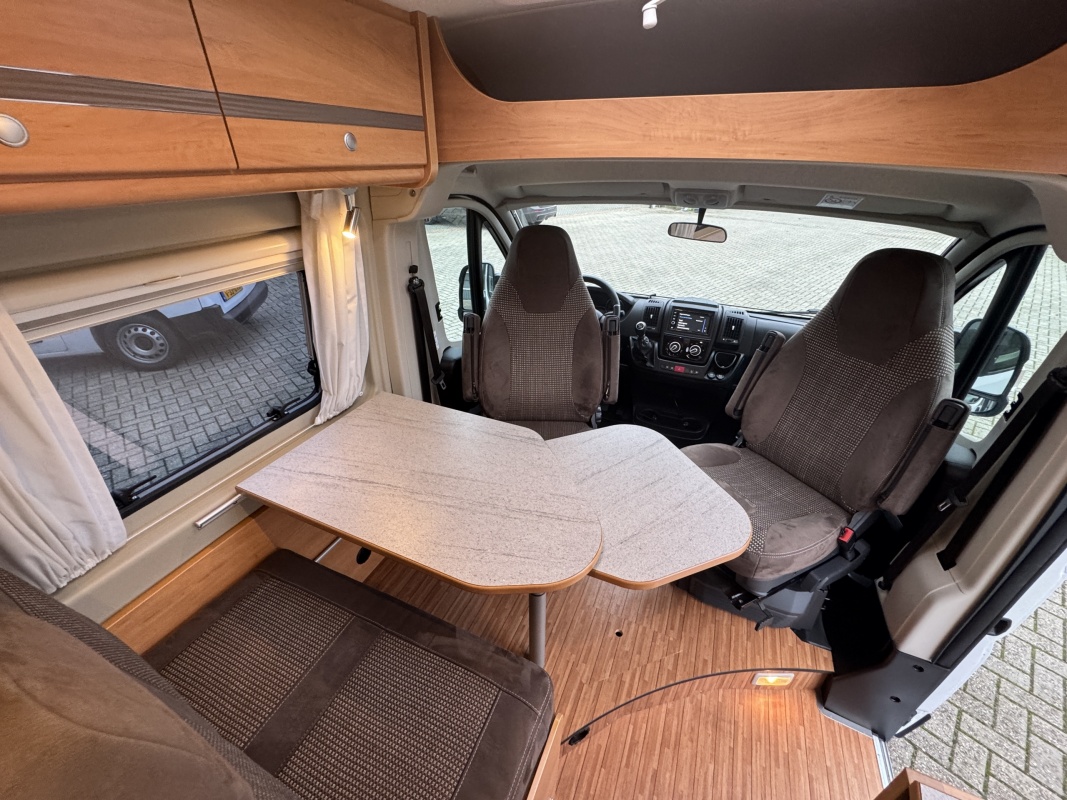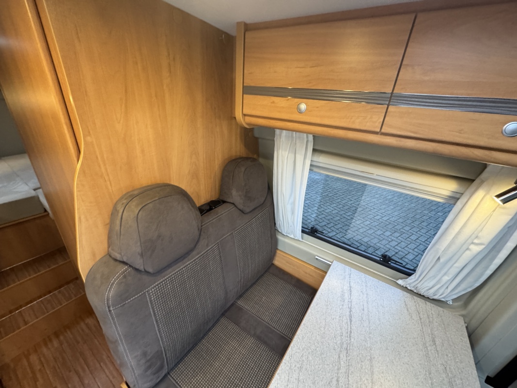 Voorin de cabine beschikt deze Possl Roadcruiser over 2 draai-, verstel-, kantelbare comfortstoelen met armleuning, daarachter een ruime dinette bank. Eventueel is de zitgroep om te leggen tot een extra bed(je).