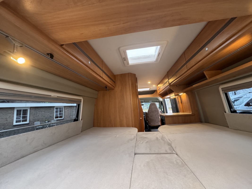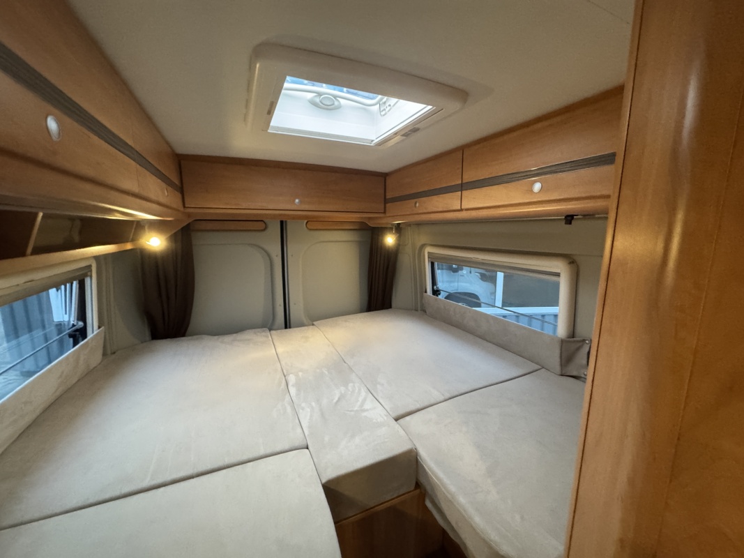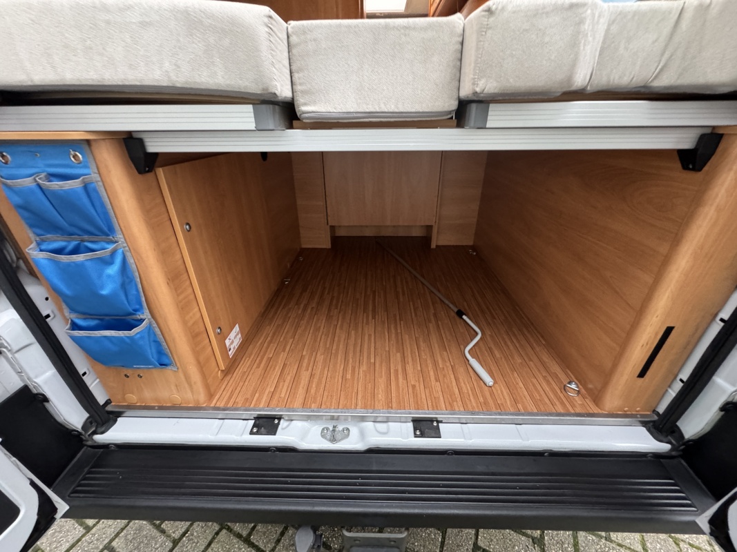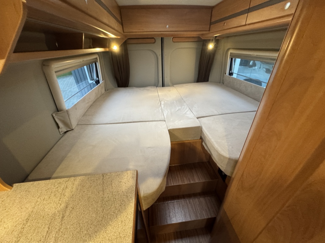 Achterin twee royale enkele bedden met een comfortabele matras en gemakkelijke instap! Onder de bedden is een grote garage / opbergruimte.