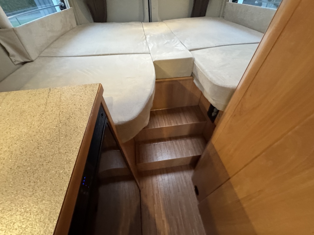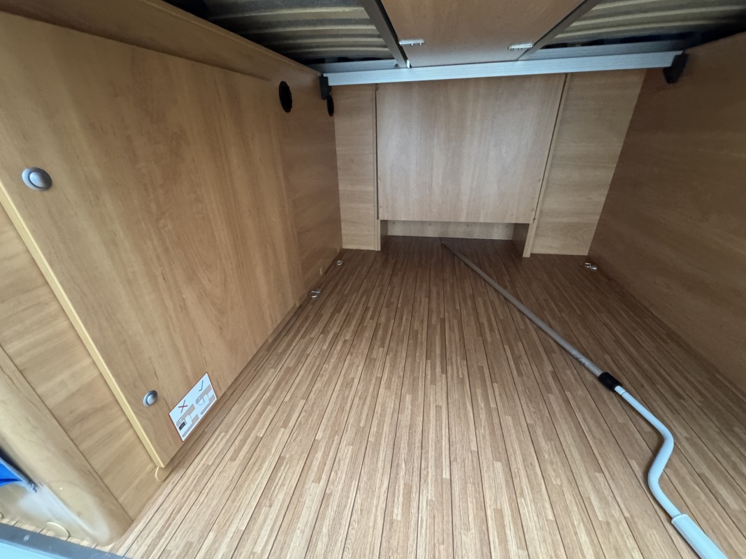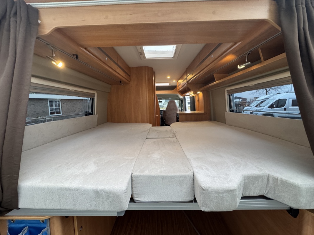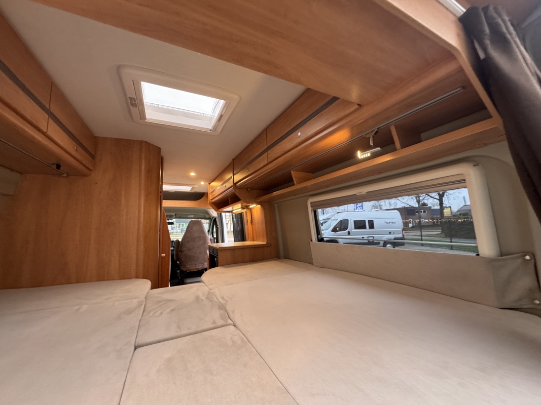 Achterin twee royale enkele bedden met een comfortabele matras en gemakkelijke instap! Onder de bedden is een grote garage / opbergruimte.
