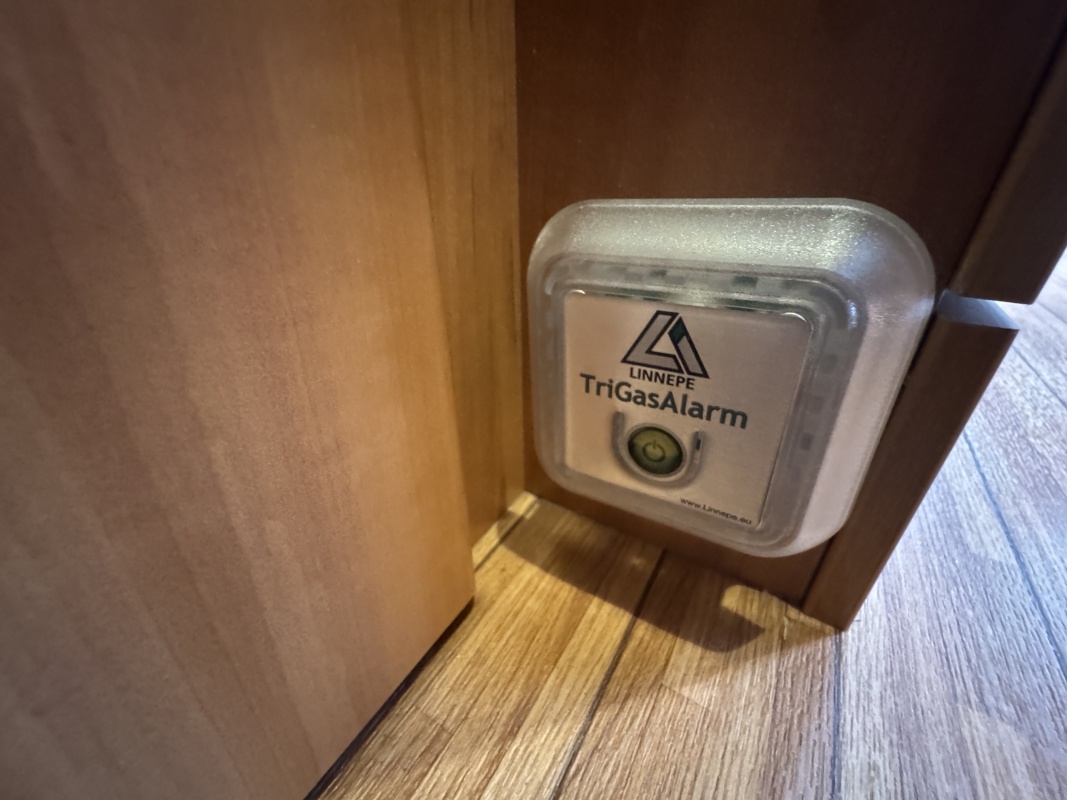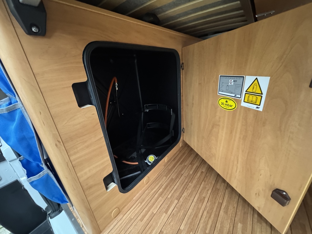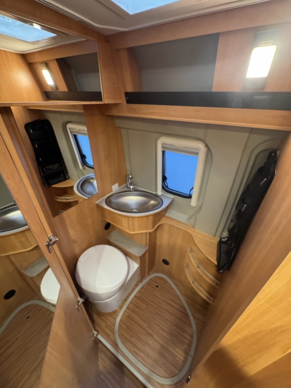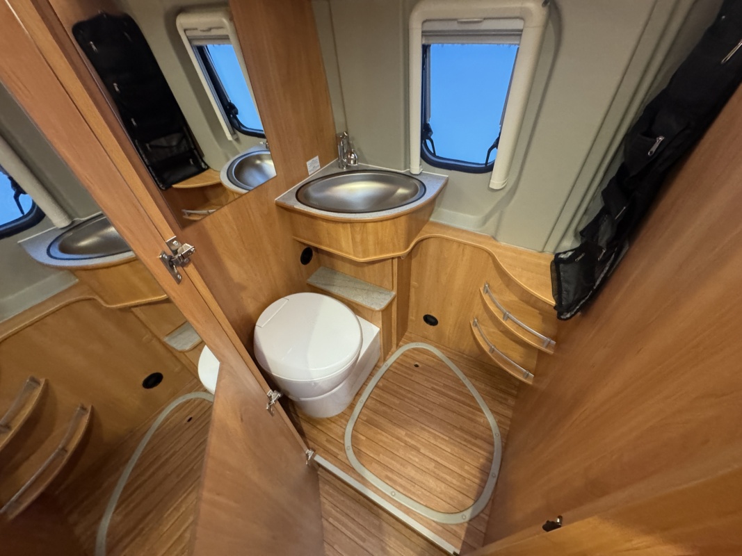 Tegenover de keuken is de natte cel met een Thetford cassettetoilet, een wastafel met toiletkast en douche!