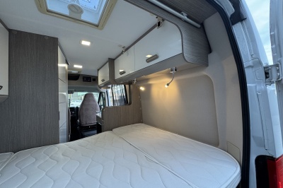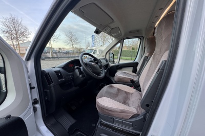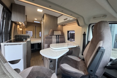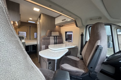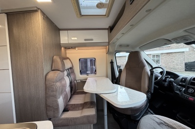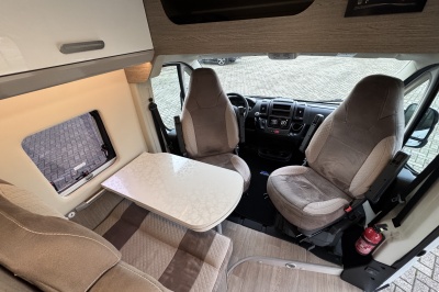 Voorin de cabine staan 2 volledig verstel-, kantel- en draaibare comfortstoelen. Daarachter een dinettebank. Samen met de voorstoelen biedt deze camper ruim plaats aan 4 personen. Tevens is hij voorzien van een 3e bed set zodat er van de zitgroep een extra bed(je) gemaakt kan worden.