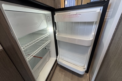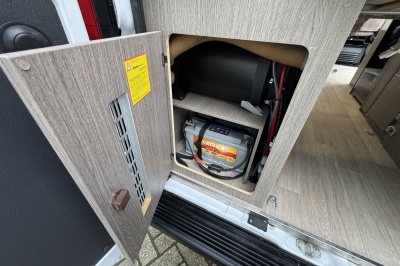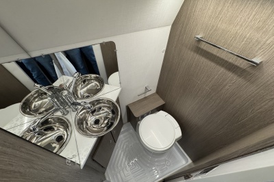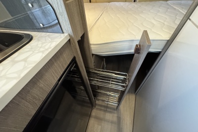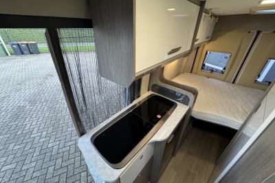 In het midden de keuken welke is uitgerust met een kooktoestel met glasafdekking, een spoelbassin met mengkraan (warm en koud), veel opbergruimte en een koelkast met vriezer. Tegenover de keuken is de badkamer met een cassettetoilet, een wastafel en de mogelijkheid om te douchen.