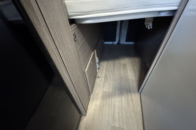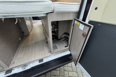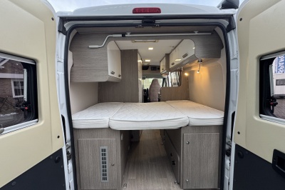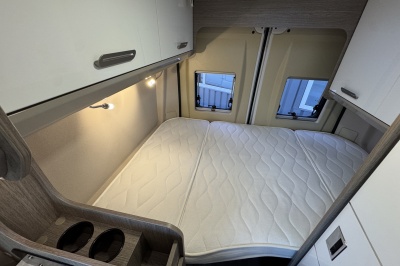 Achterin een twee persoons bed met een gemakkelijke instap. Onder het bed is een grote garage / opbergruimte die zowel van binnen als van buiten is te benaderen.