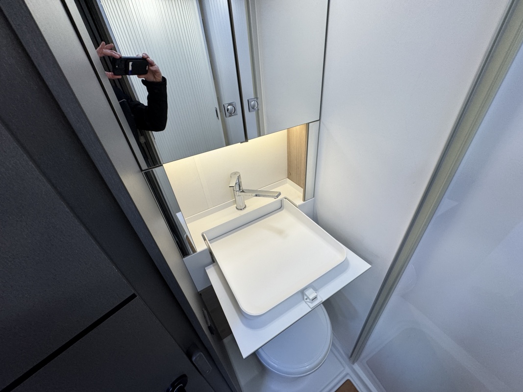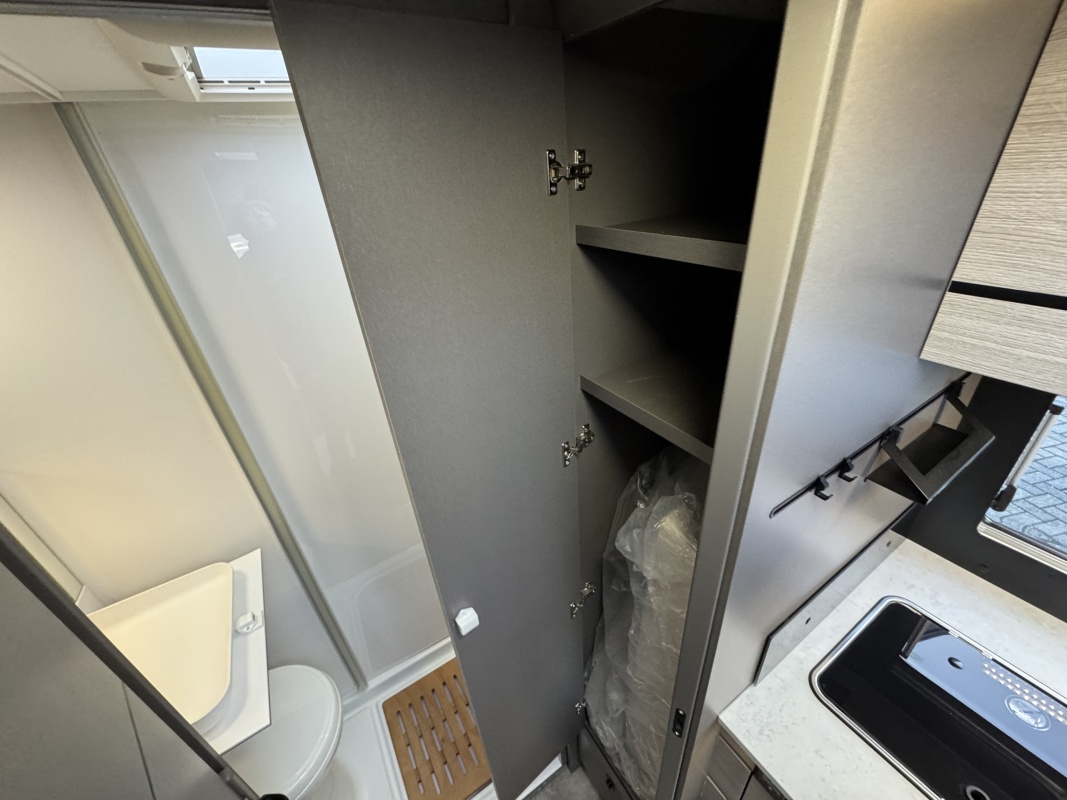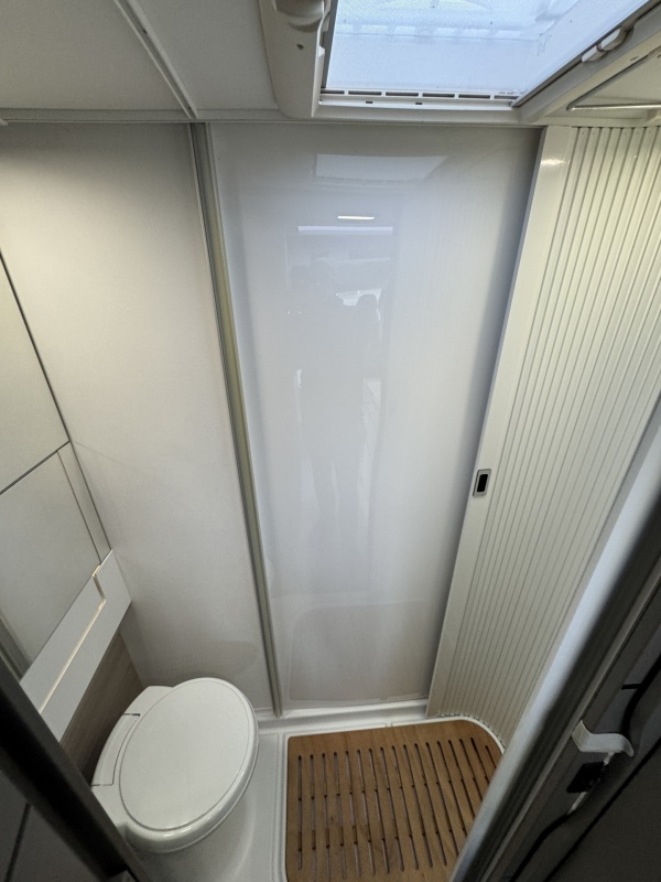 Achterin bevindt zich een ruime badkamer, wat deze camper extra comfortabel maakt.