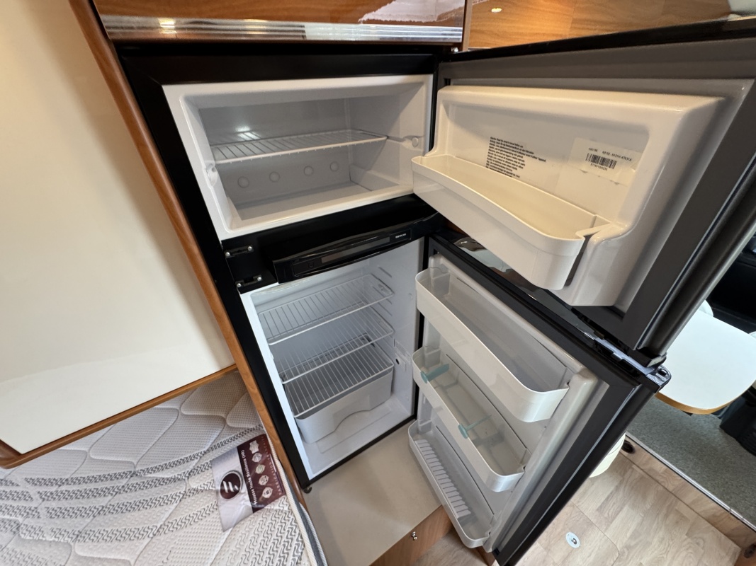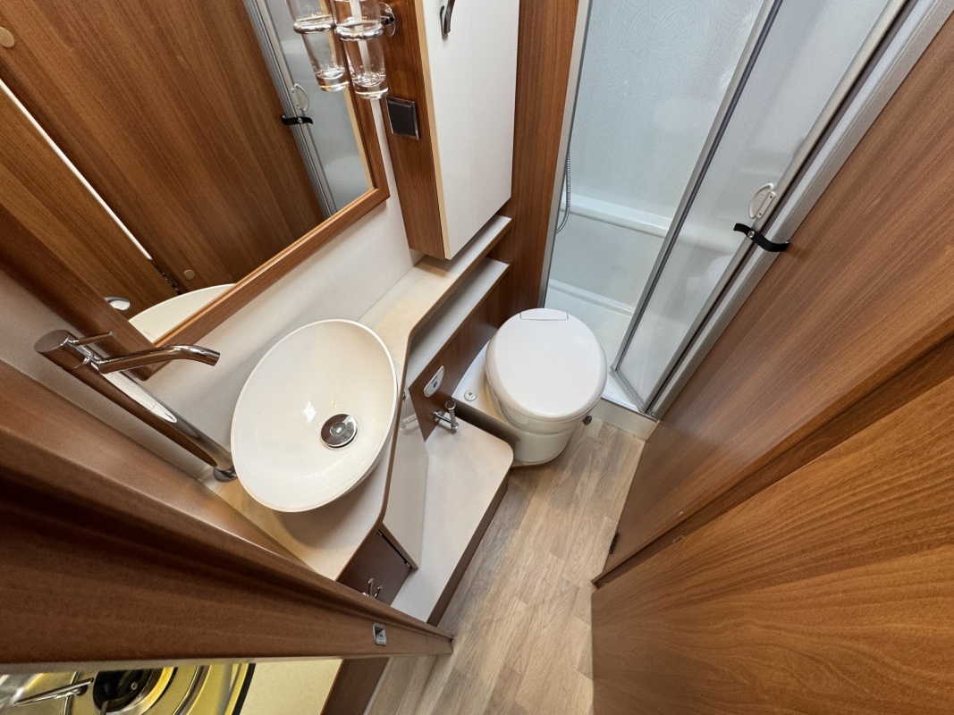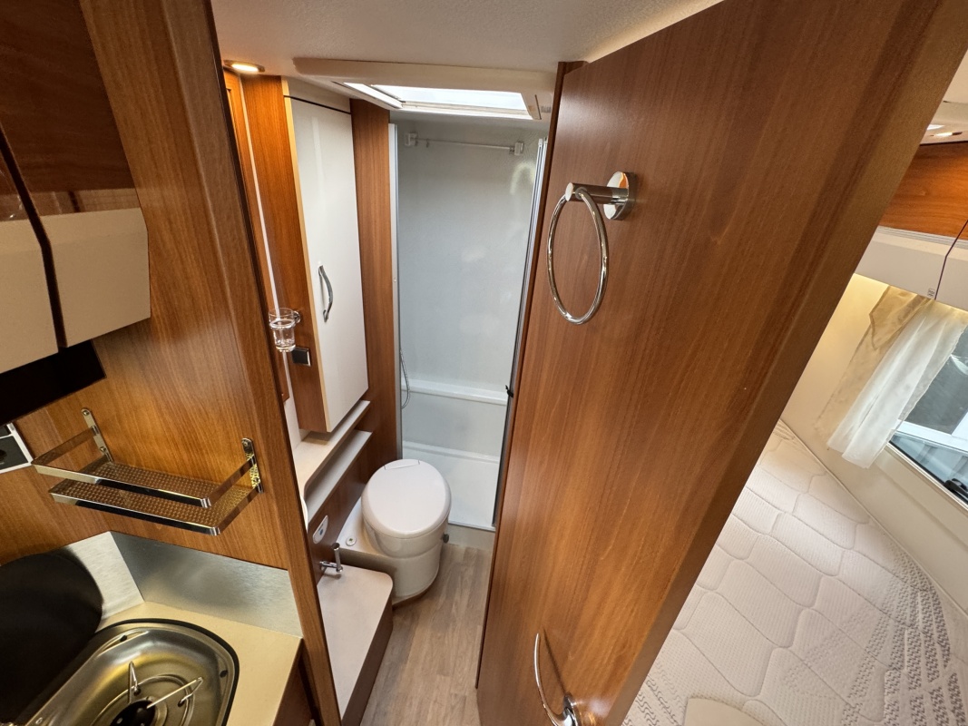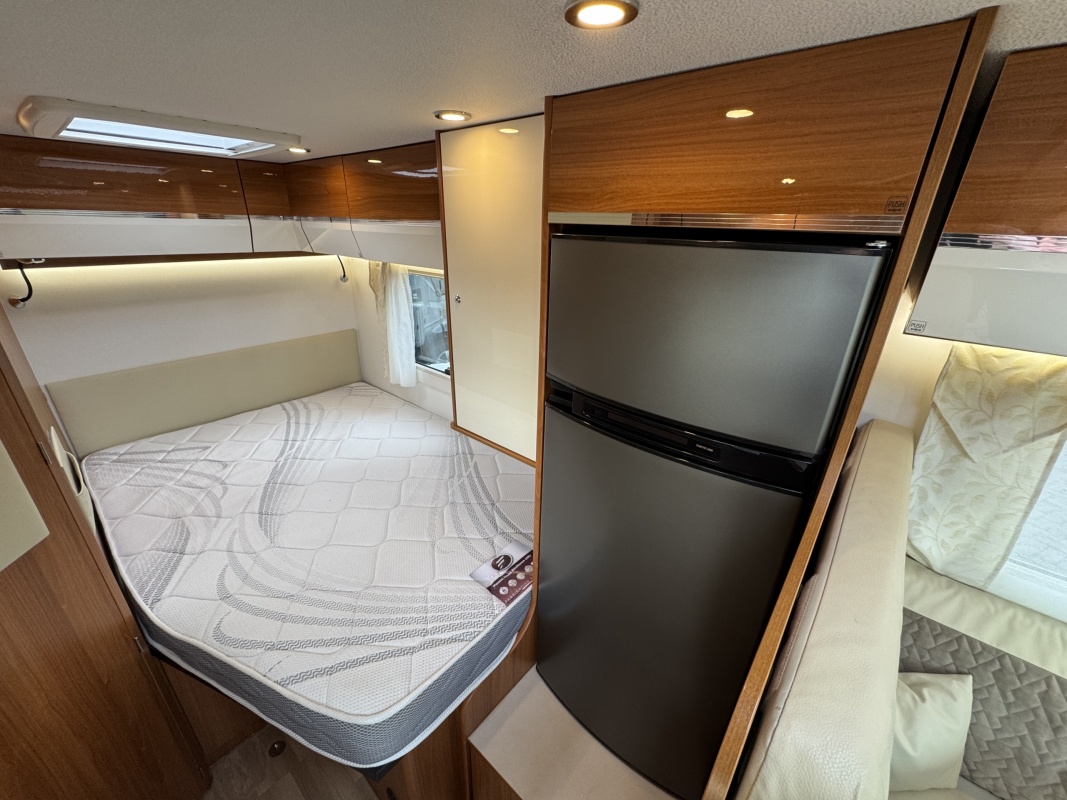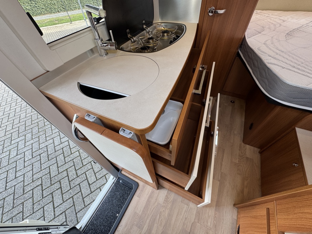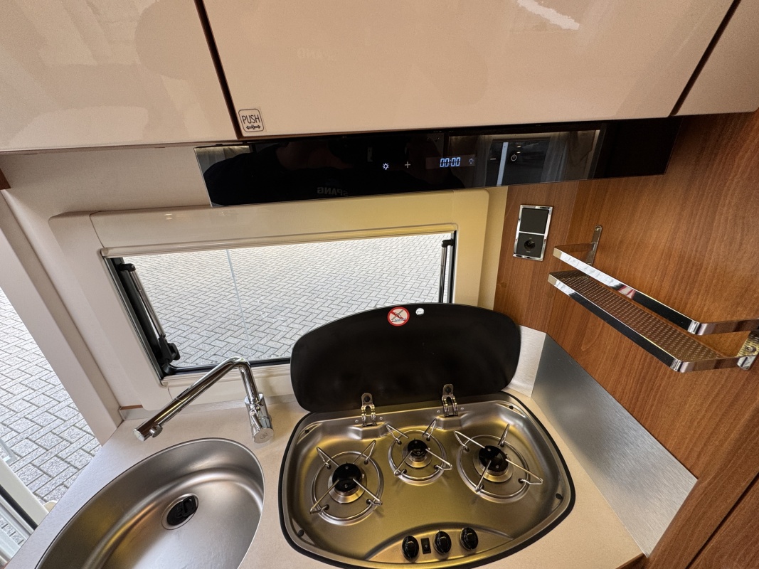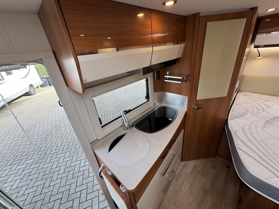 In het midden van de camper bevindt zich de praktische keuken met veel werkruimte. Deze is uitgerust met een 3-pits kooktoestel met glasafdekking, een luxe afzuigkap, diverse kastjes en lades en een grote koelkast met vriezer.