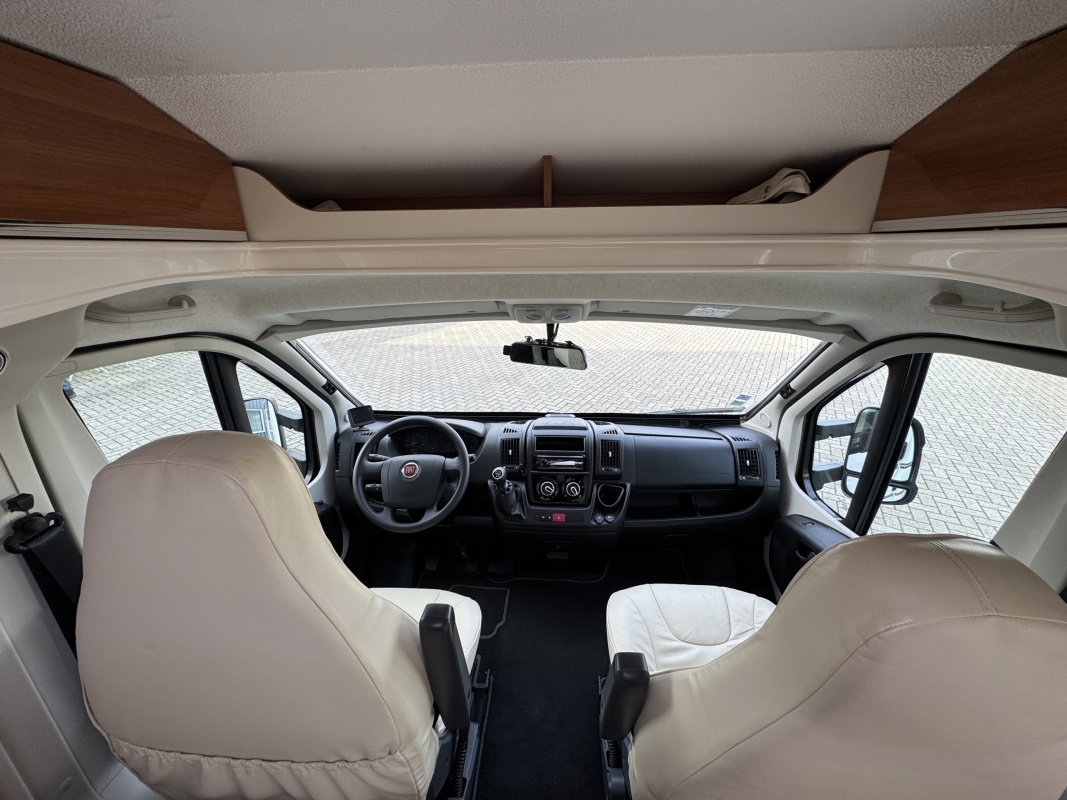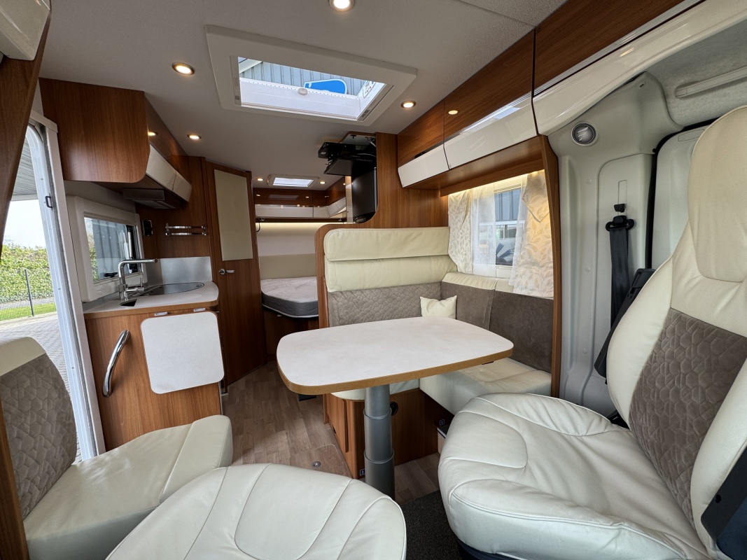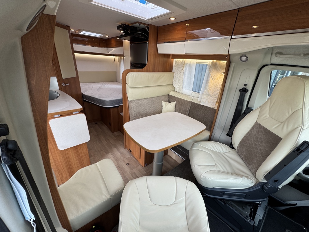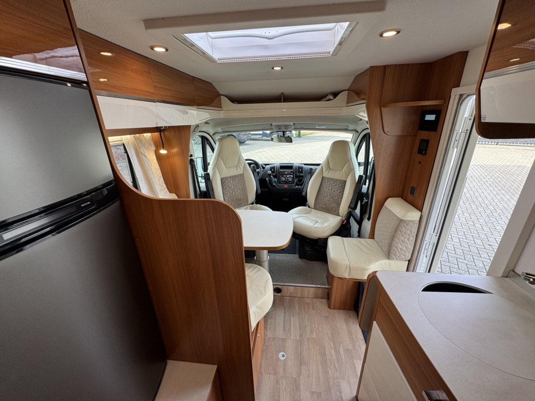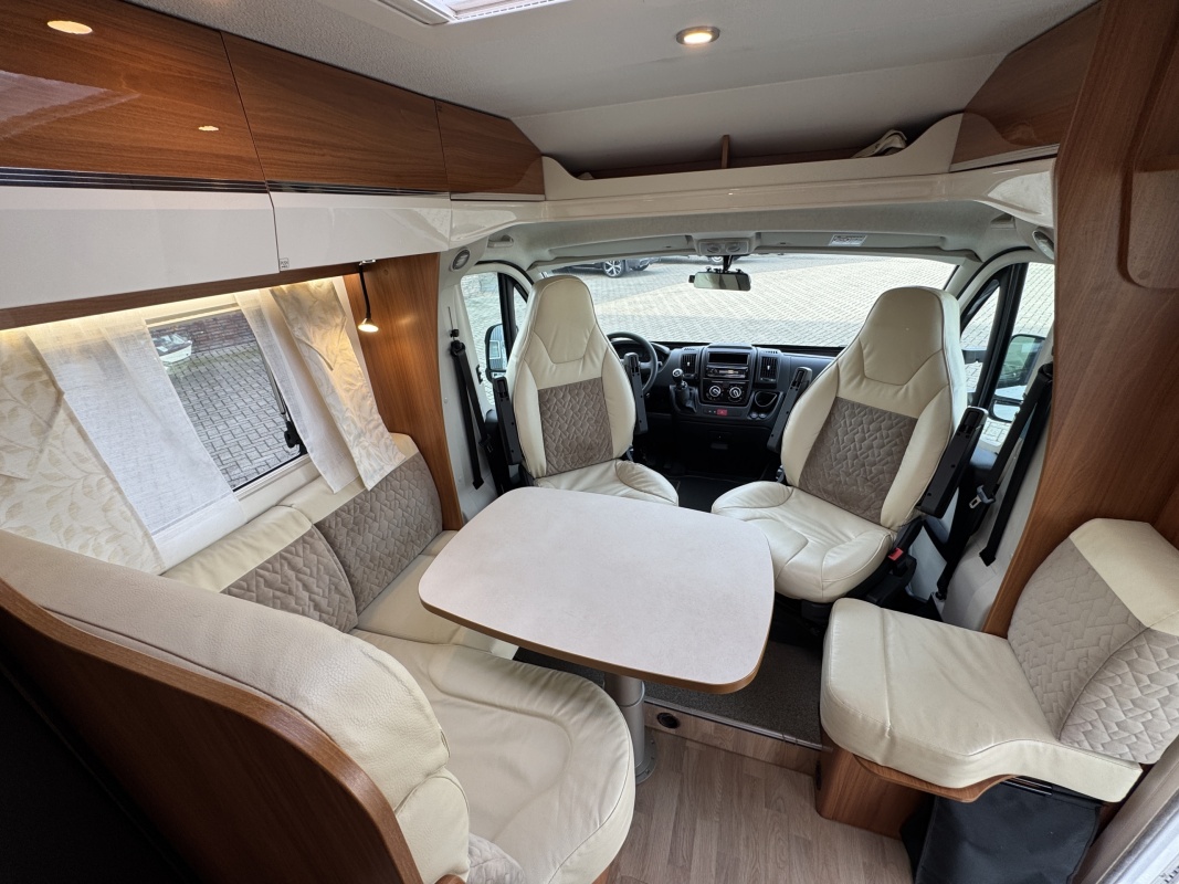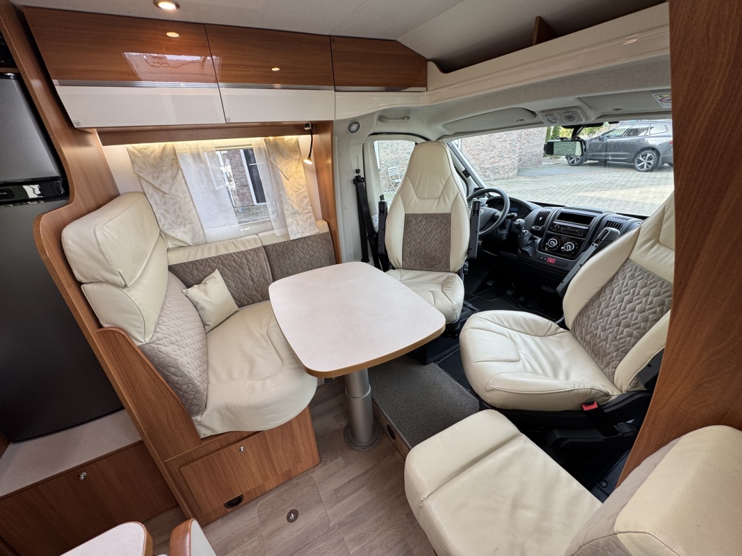 Voorin de cabine bevinden zich twee luxe draai-, verstel- en kantelbare comfortstoelen die samen met de ruime zitgroep een gezellige leefruimte vormen. De zitgroep bestaat uit een L-zit met langsbank, waardoor er volop zitruimte is.