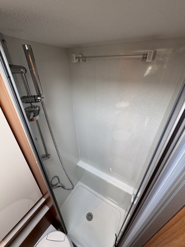 Naast het bed bevindt zich de badkamer met douche, toilet en wastafel, zeer functioneel ingericht.