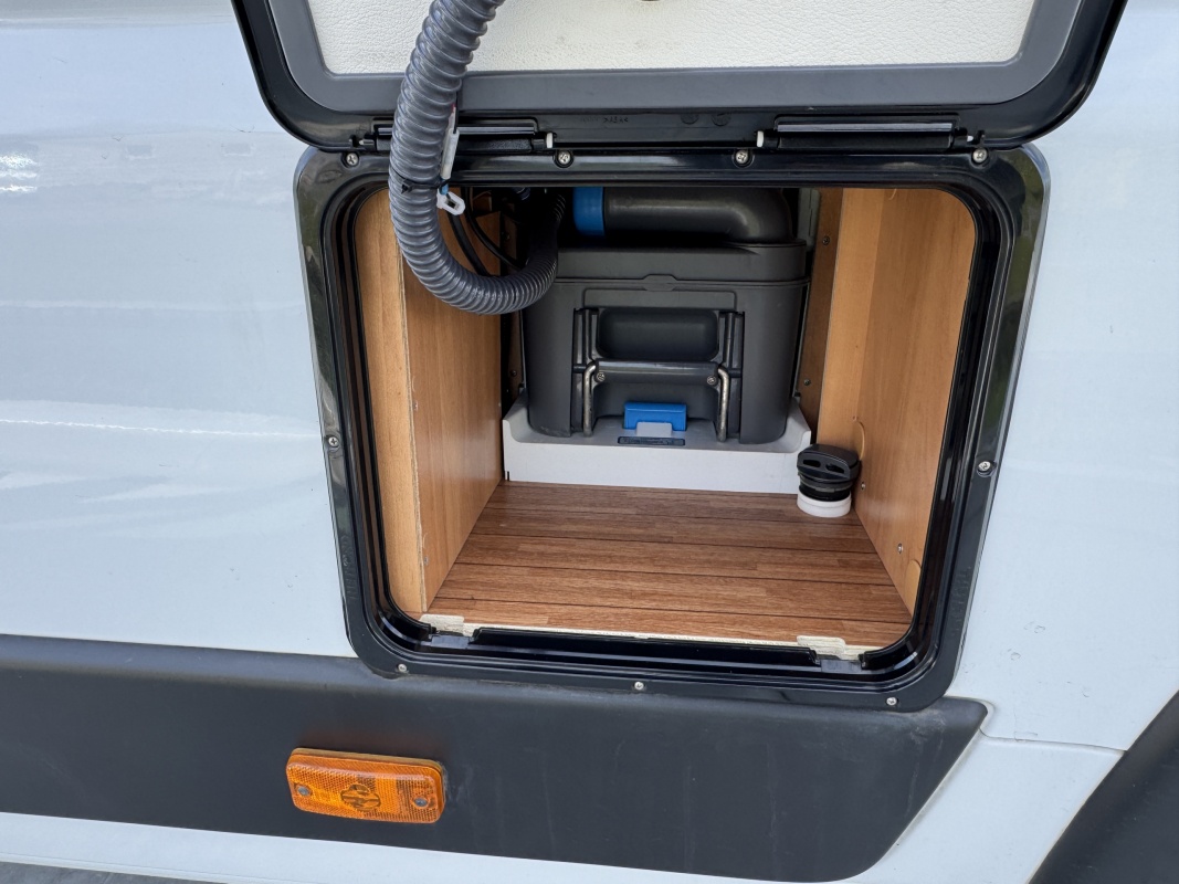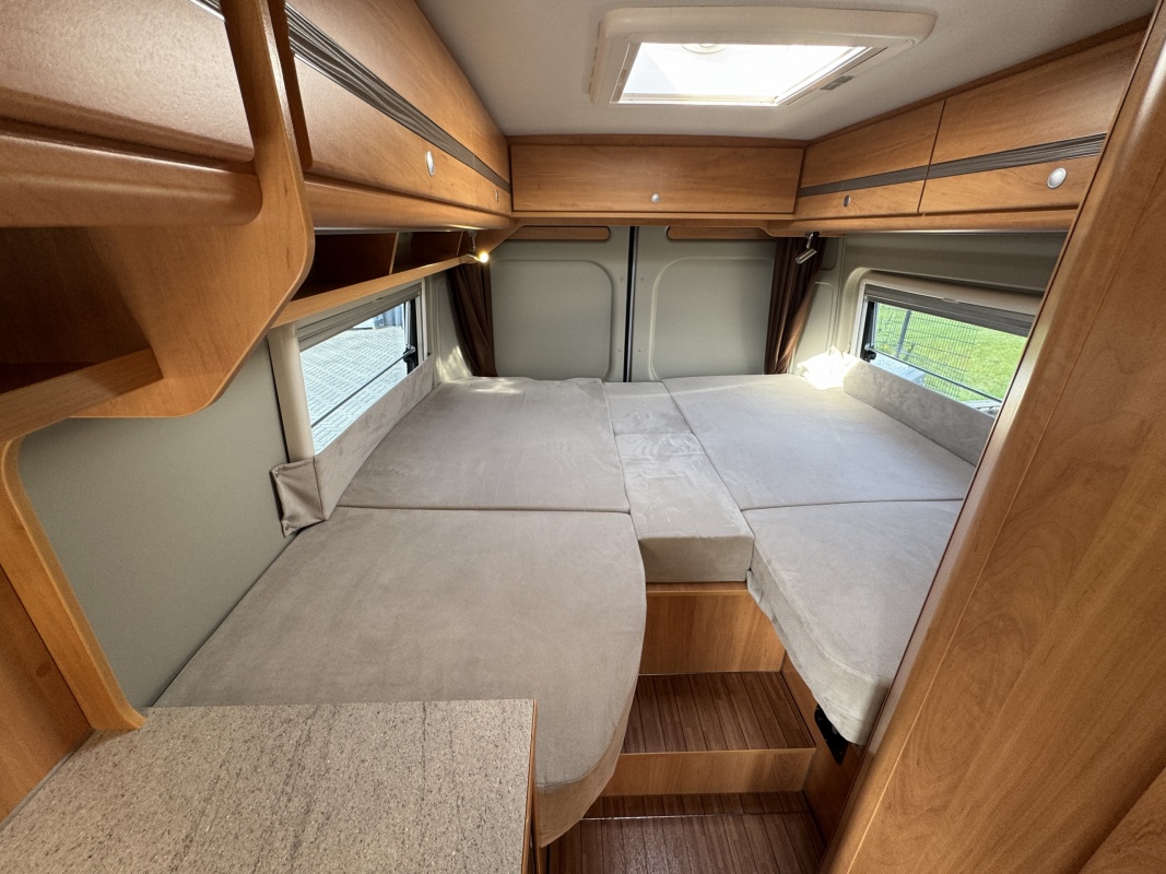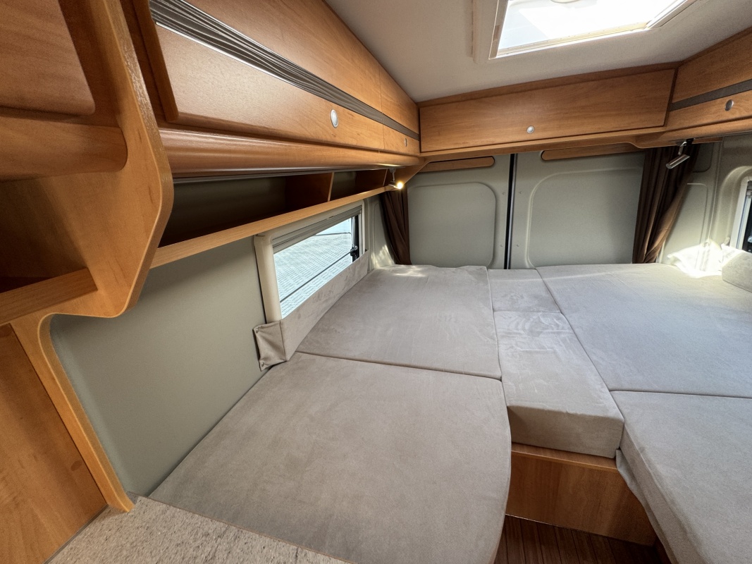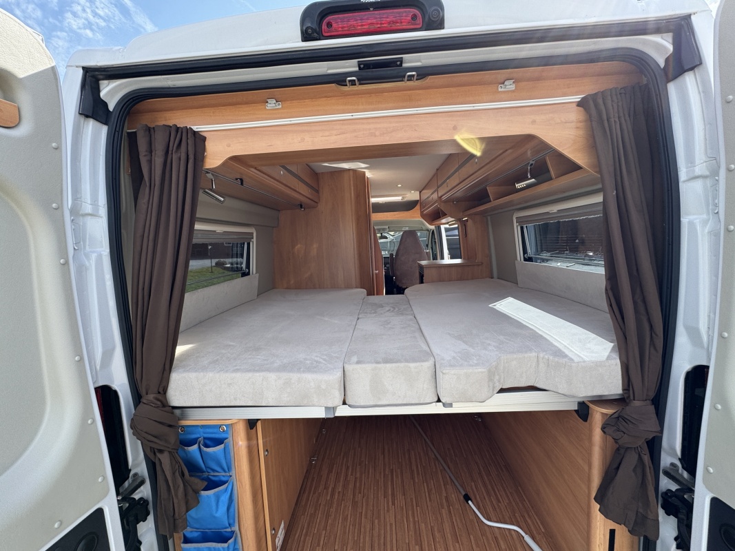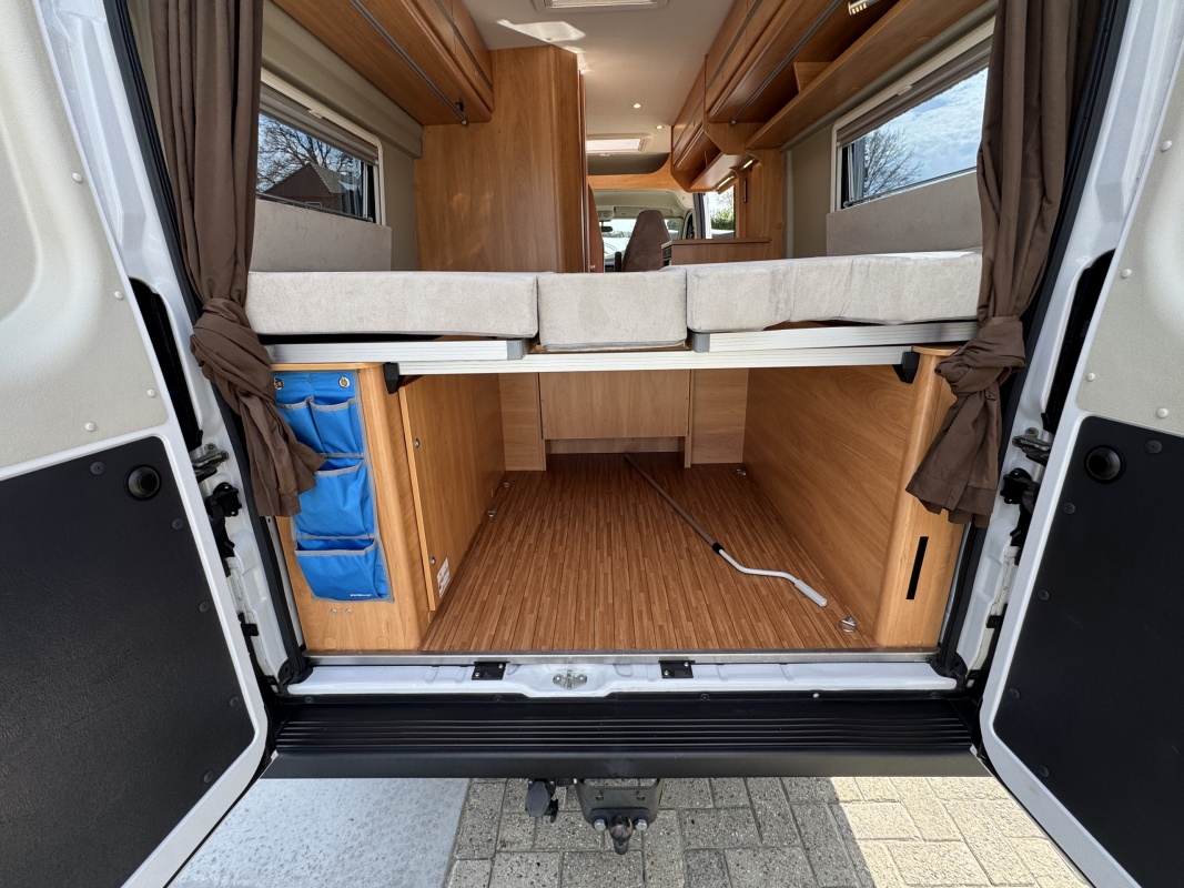 Achterin zijn twee royale enkele bedden geplaatst met comfortabele matrassen en een gemakkelijke instap. Onder de bedden bevindt zich een grote garage/opbergruimte, ideaal voor fietsen, kampeeruitrusting en bagage.
