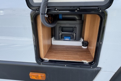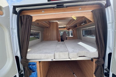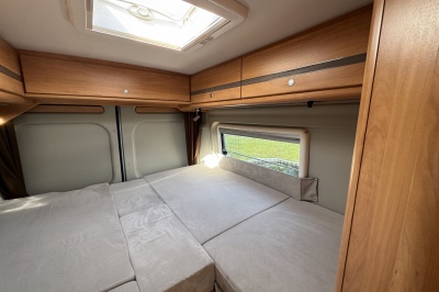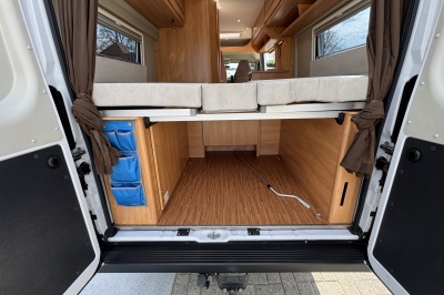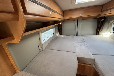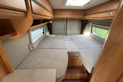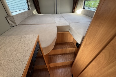 Achterin zijn twee royale enkele bedden geplaatst met comfortabele matrassen en een gemakkelijke instap. Onder de bedden bevindt zich een grote garage/opbergruimte, ideaal voor fietsen, kampeeruitrusting en bagage.