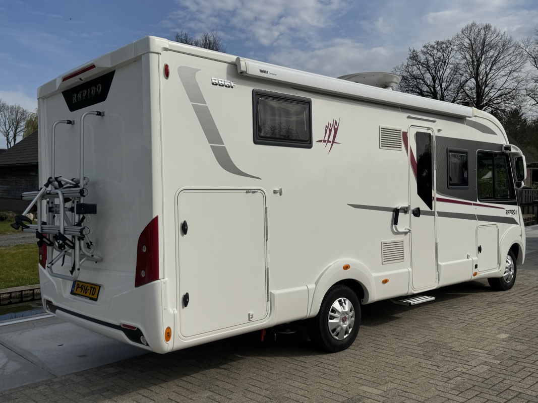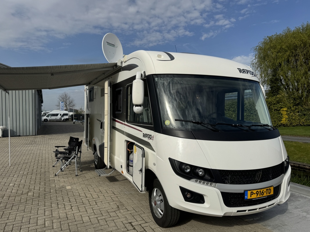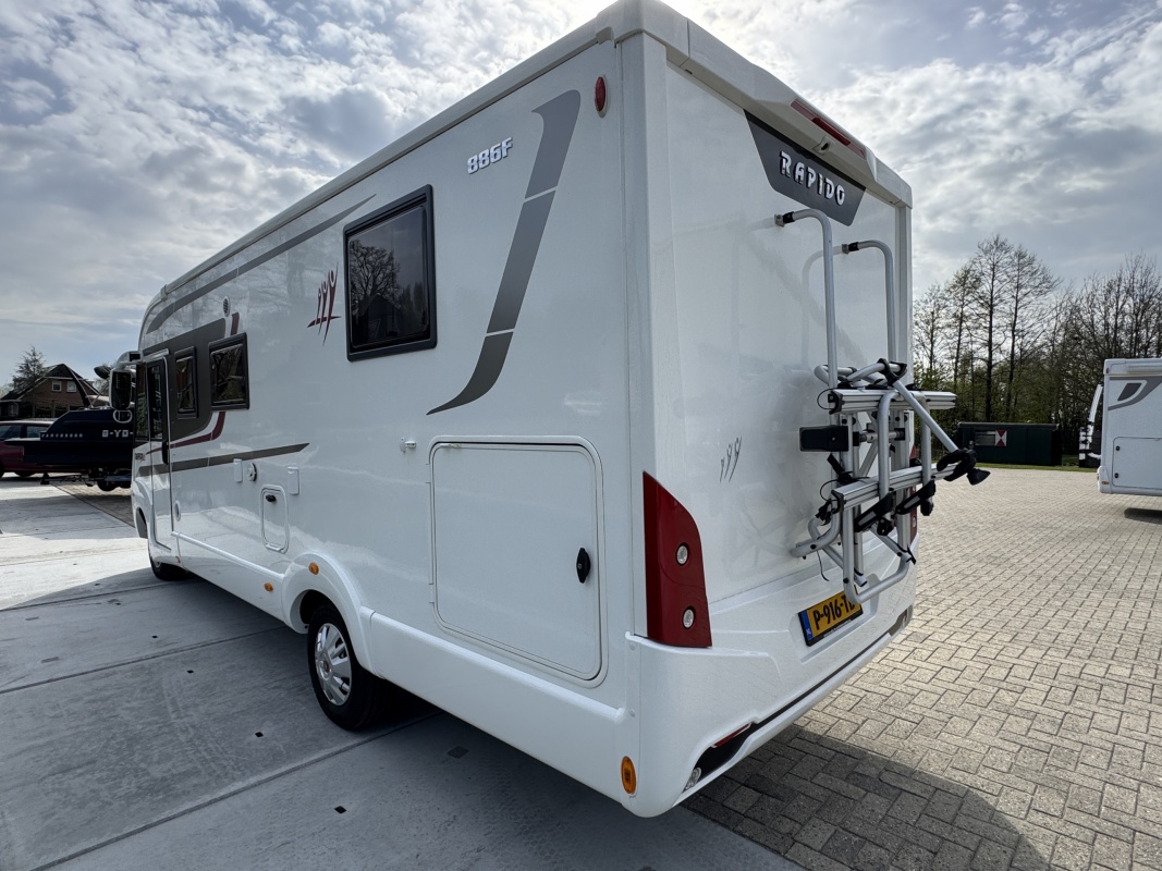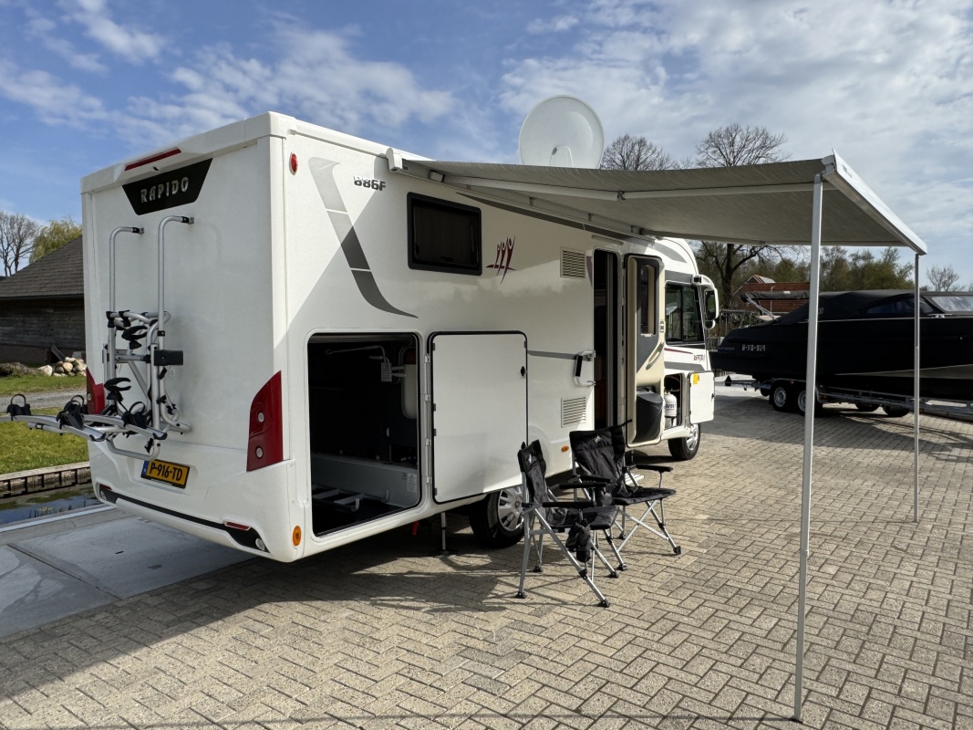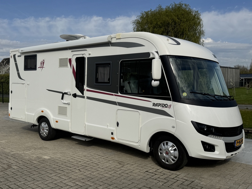 NIEUW BINNEN - in absolute NIEUWSTAAT verkerende Rapido 886 F integraal camper met top indeling! Achter een groot in hoogte verstelbaar queensbed met gemakkelijke instap en veel ruimte om het bed en een XXL garage eronder! De face to face zitgroep maakt hem heerlijk ruim! Wilt u logés meenemen? Voorin boven de cabine is een groot twee persoons hefbed die u in een handomdraai laat zakken.