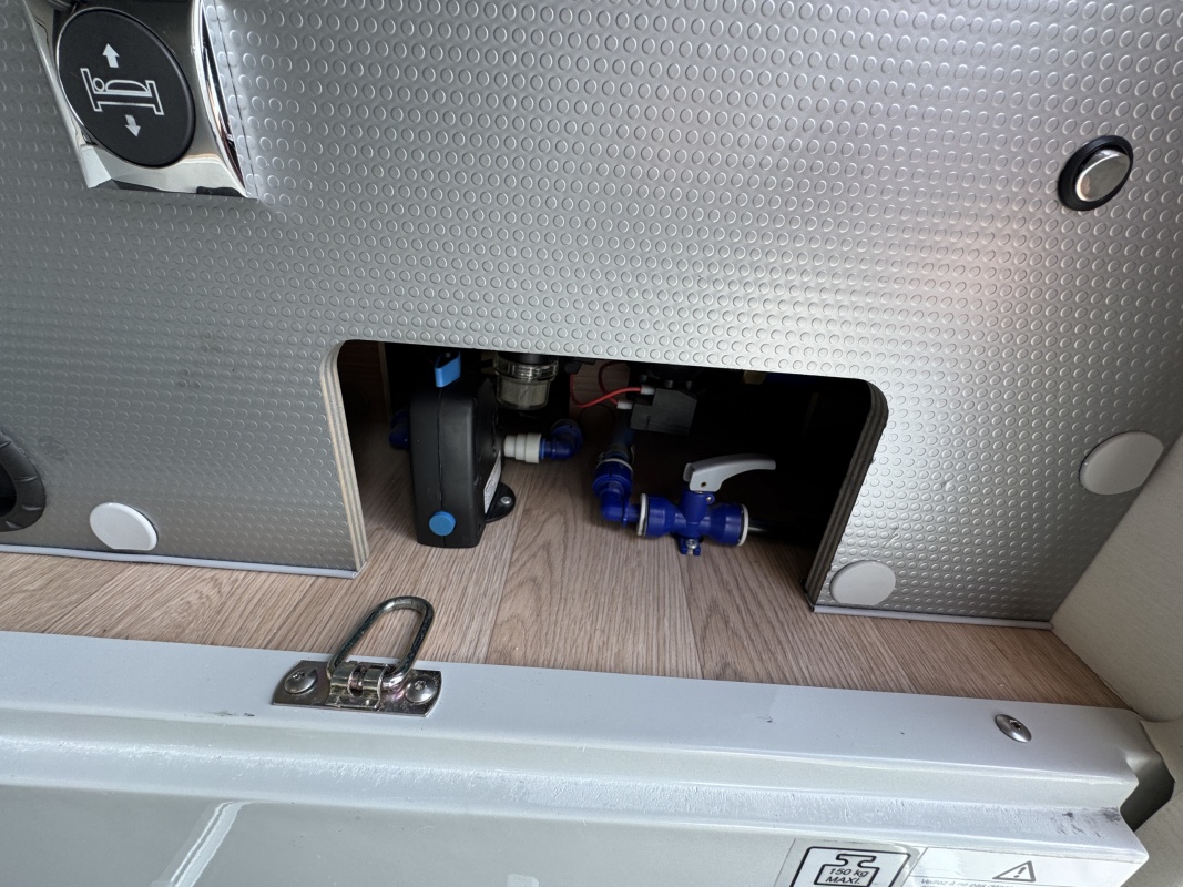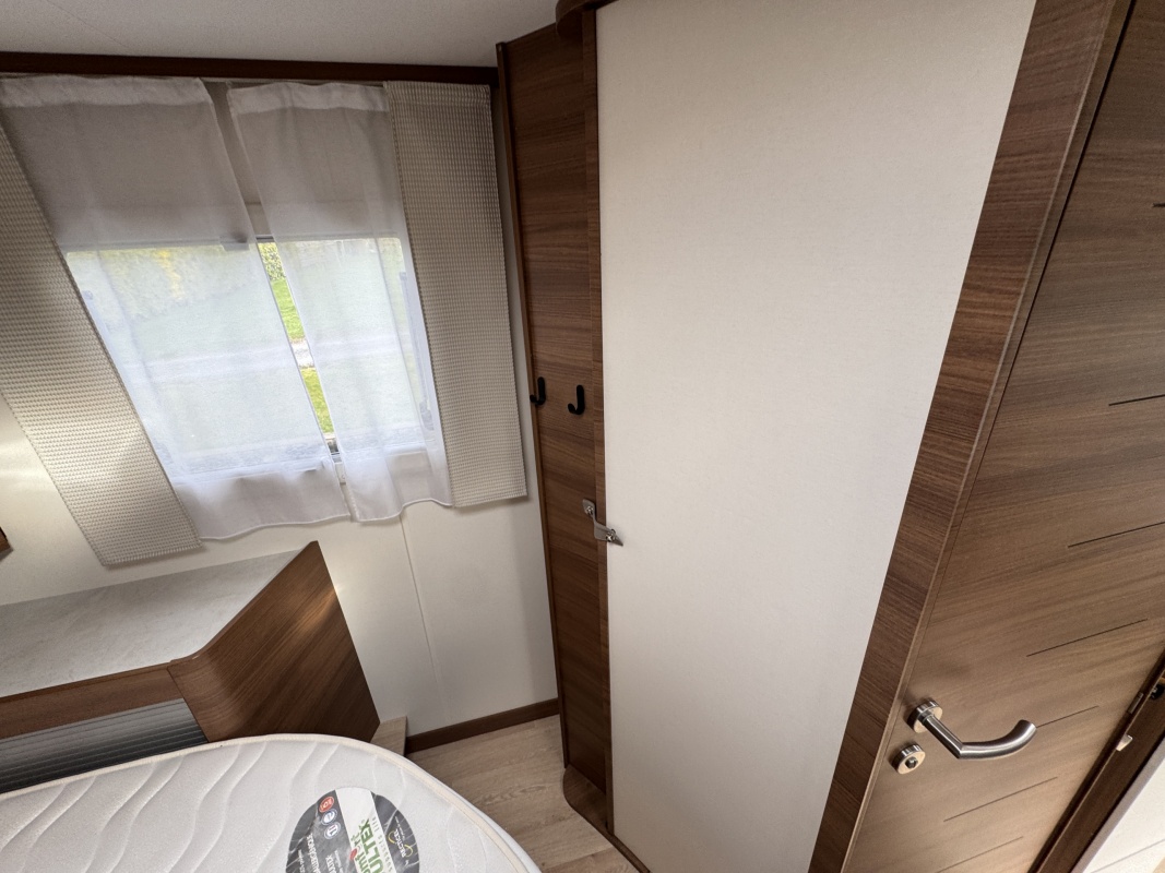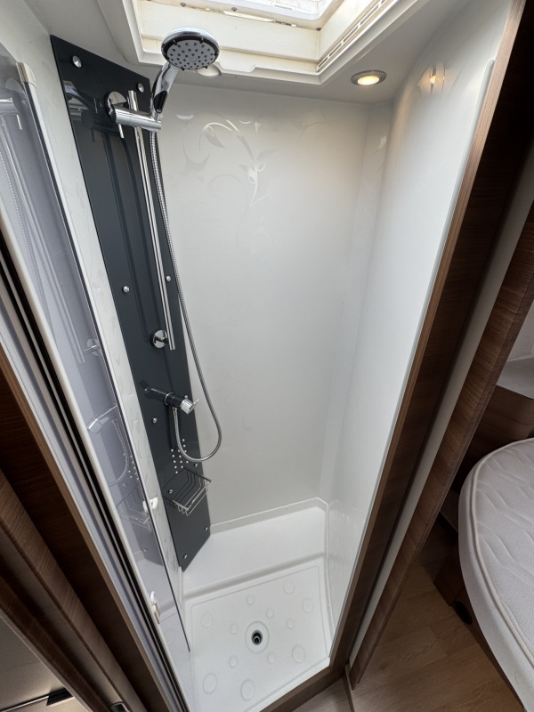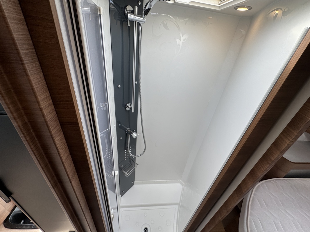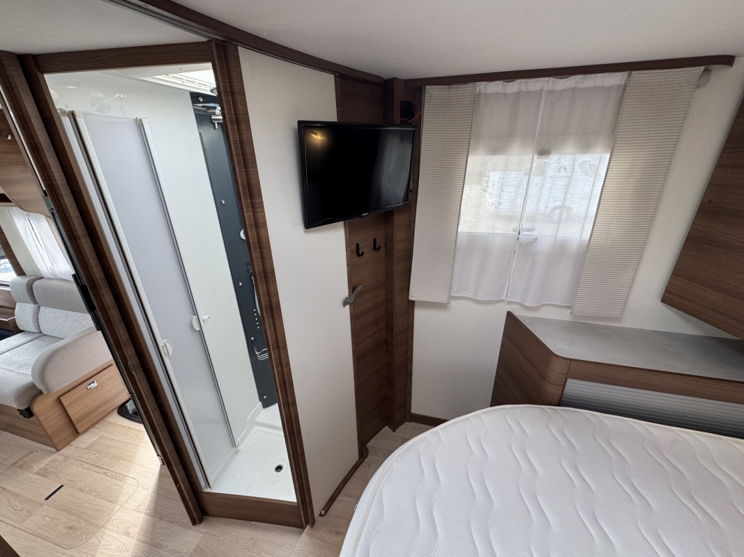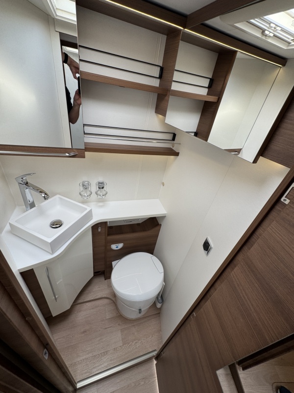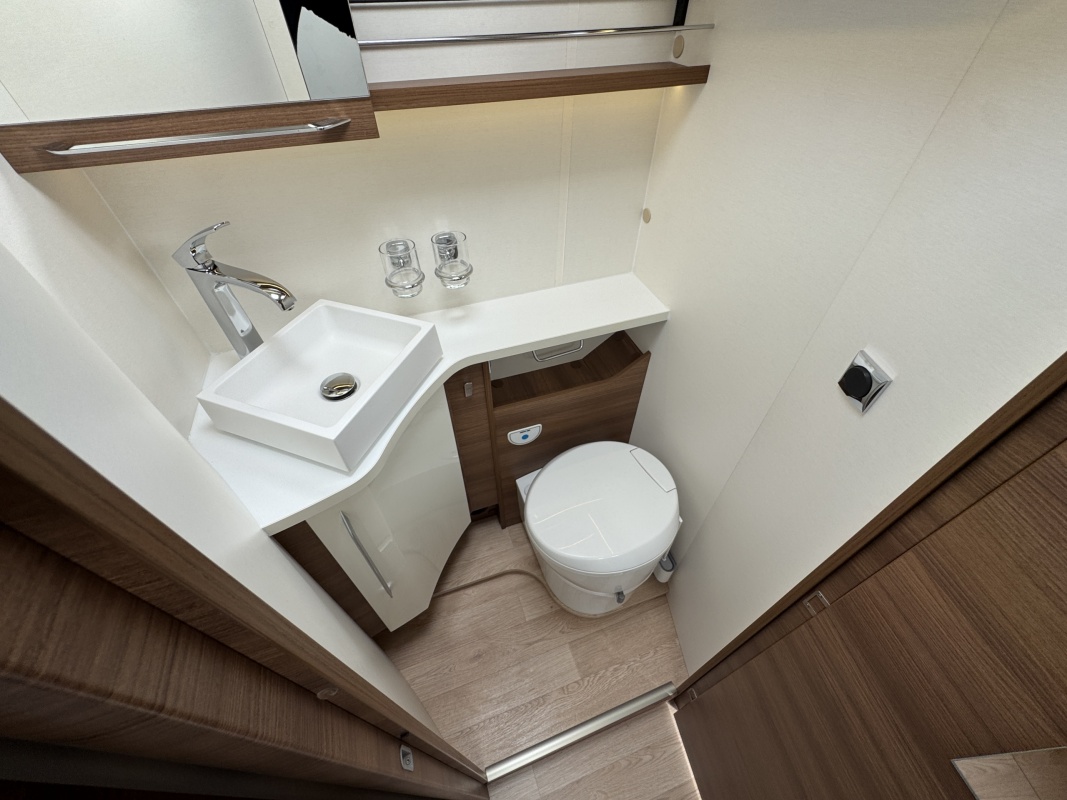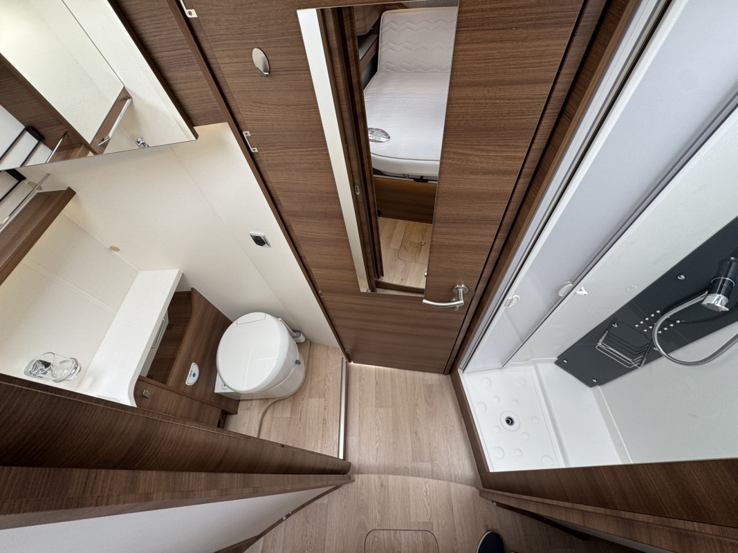 Voor het bed is een ruime aparte douchecabine en aan de andere zijde de toiletruimte met cassettetoilet en een wastafel en toiletkast.