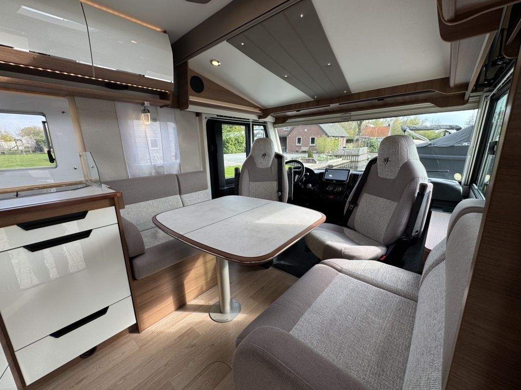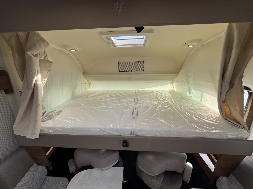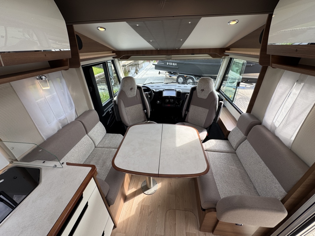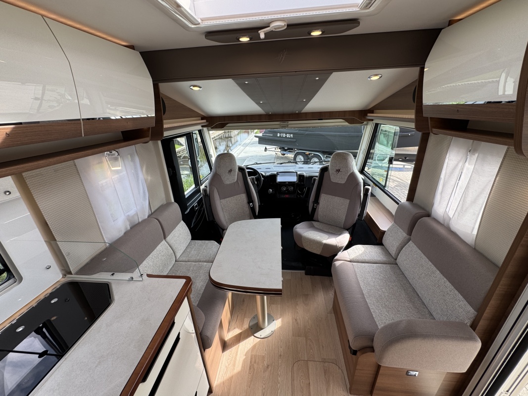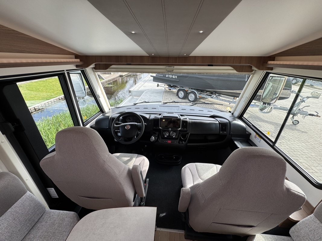 Voorin de cabine staan twee volledig draai- en verstelbare comfortstoelen, daarboven een groot twee persoons hefbed. Een face to face zitgroep waarbij u de voorstoelen kan draaien biedt een enorme ruime en gezellige zitgroep. De tafel in opklap- en volledig verschuif- en draaibaar.