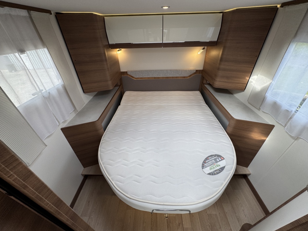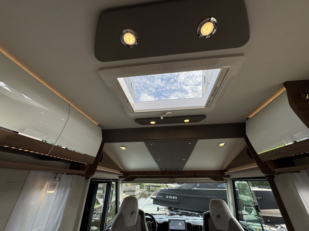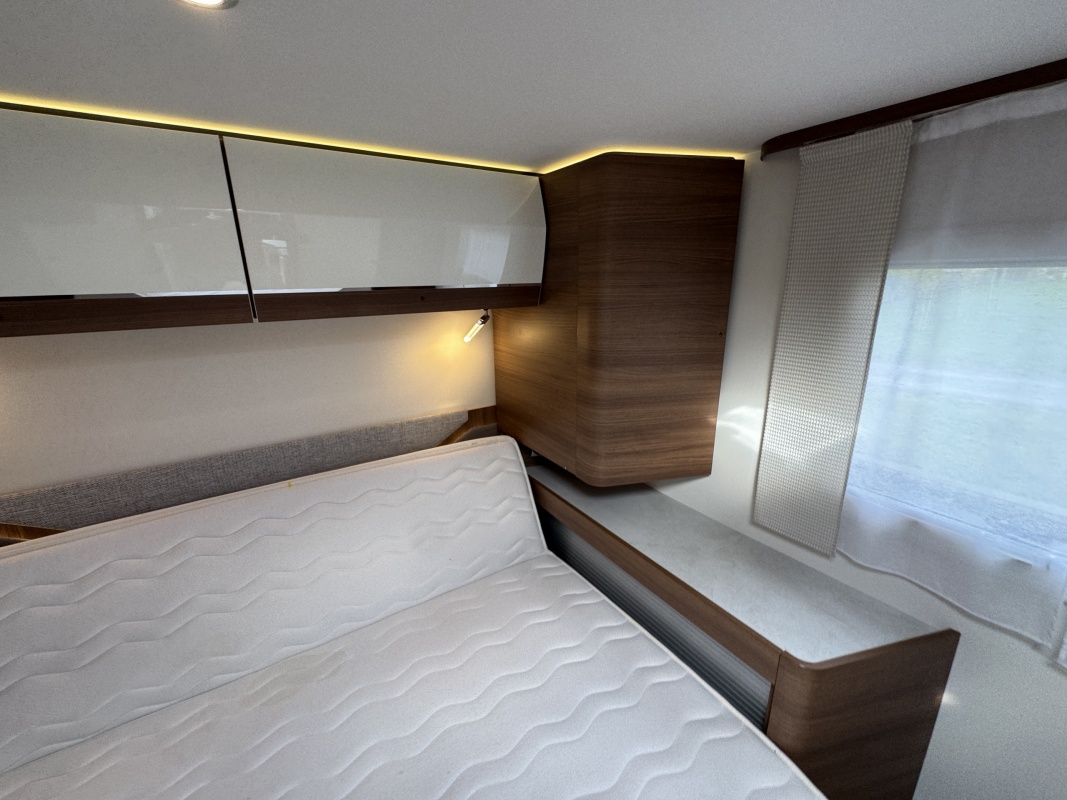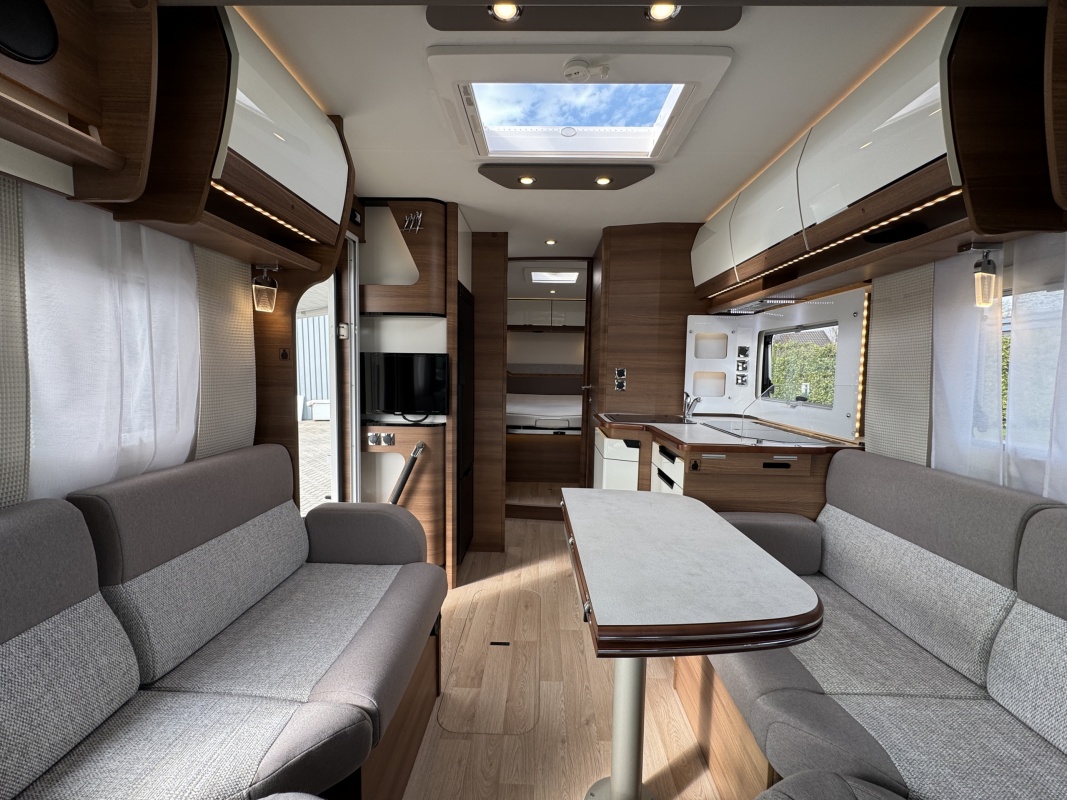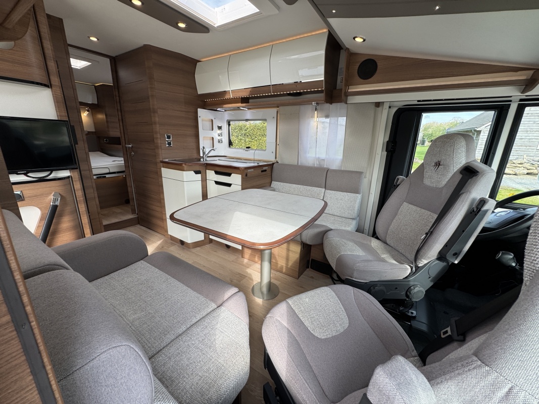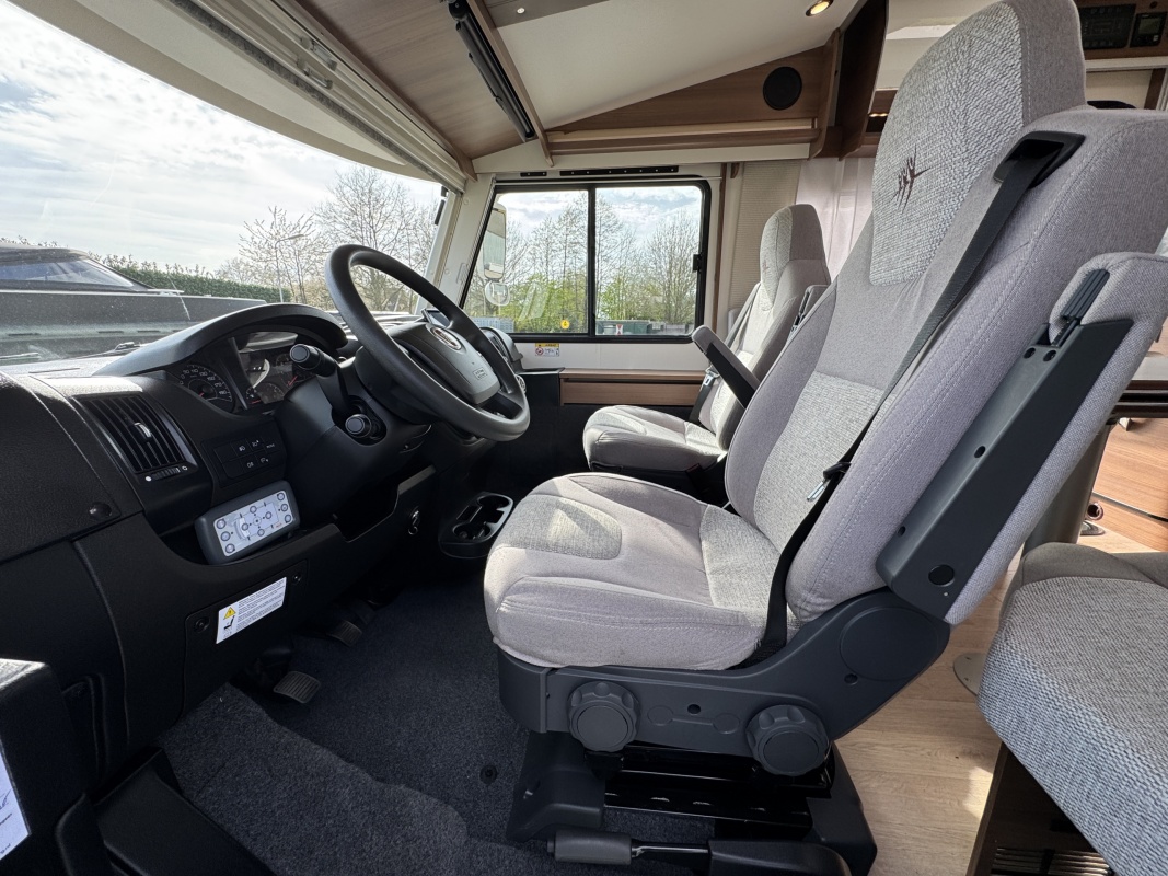 Voorin de cabine staan twee volledig draai- en verstelbare comfortstoelen, daarboven een groot twee persoons hefbed. Een face to face zitgroep waarbij u de voorstoelen kan draaien biedt een enorme ruime en gezellige zitgroep. De tafel in opklap- en volledig verschuif- en draaibaar.