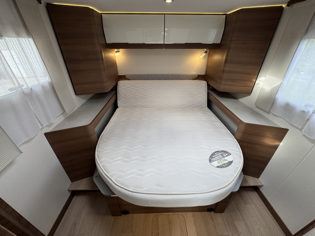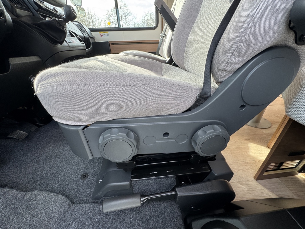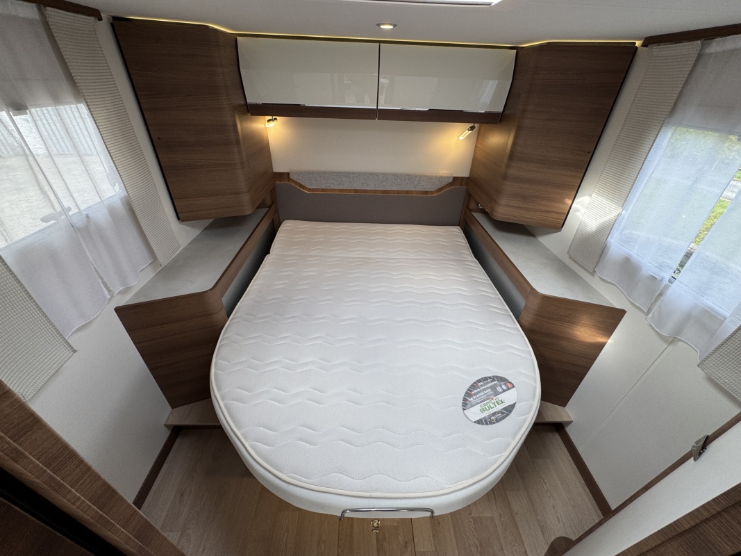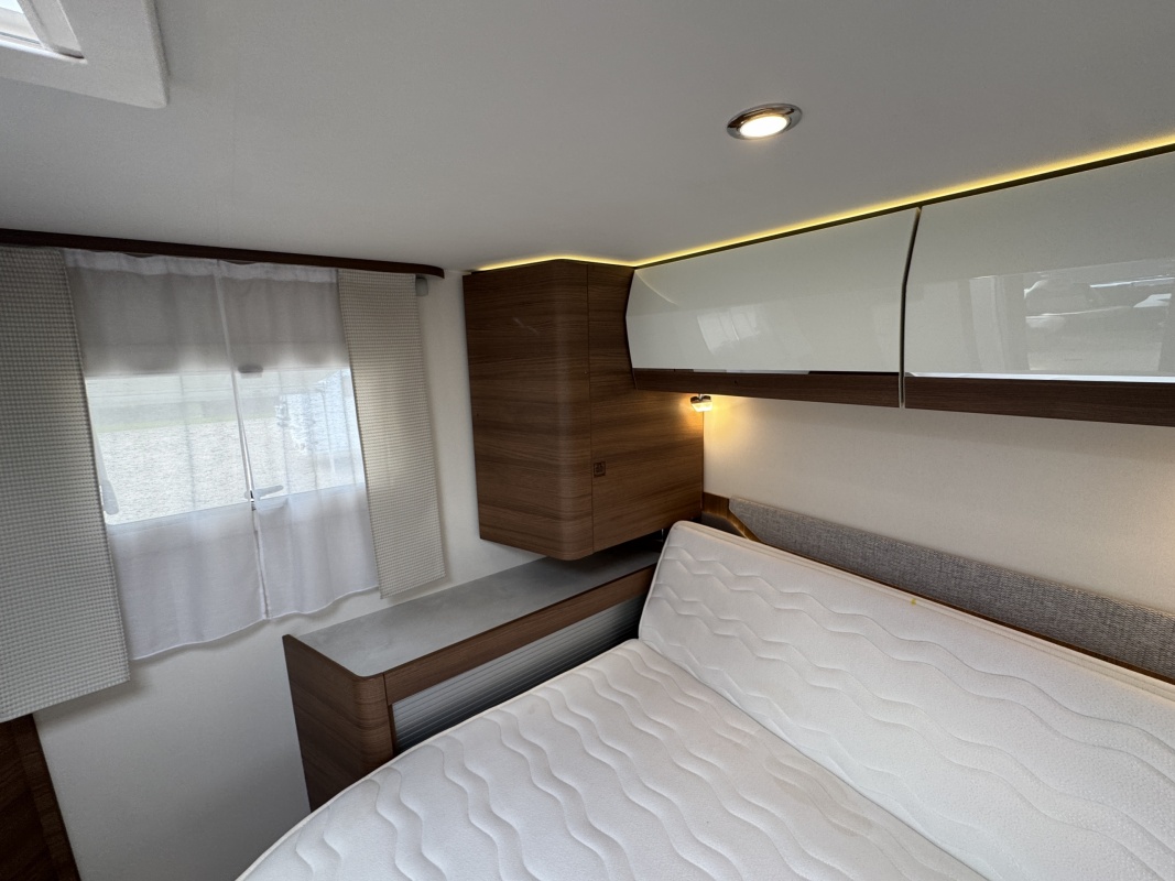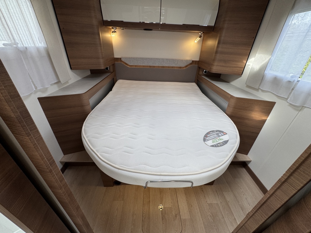Voorin de cabine staan twee volledig draai- en verstelbare comfortstoelen, daarboven een groot twee persoons hefbed. Een face to face zitgroep waarbij u de voorstoelen kan draaien biedt een enorme ruime en gezellige zitgroep. De tafel in opklap- en volledig verschuif- en draaibaar.