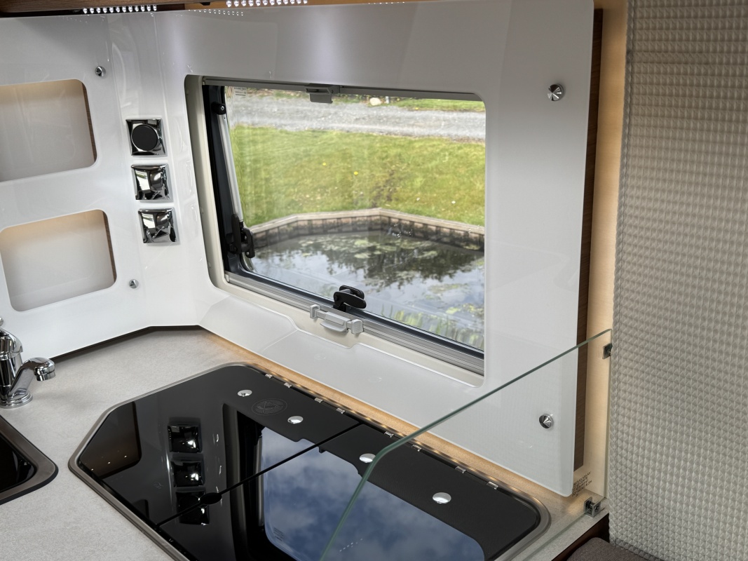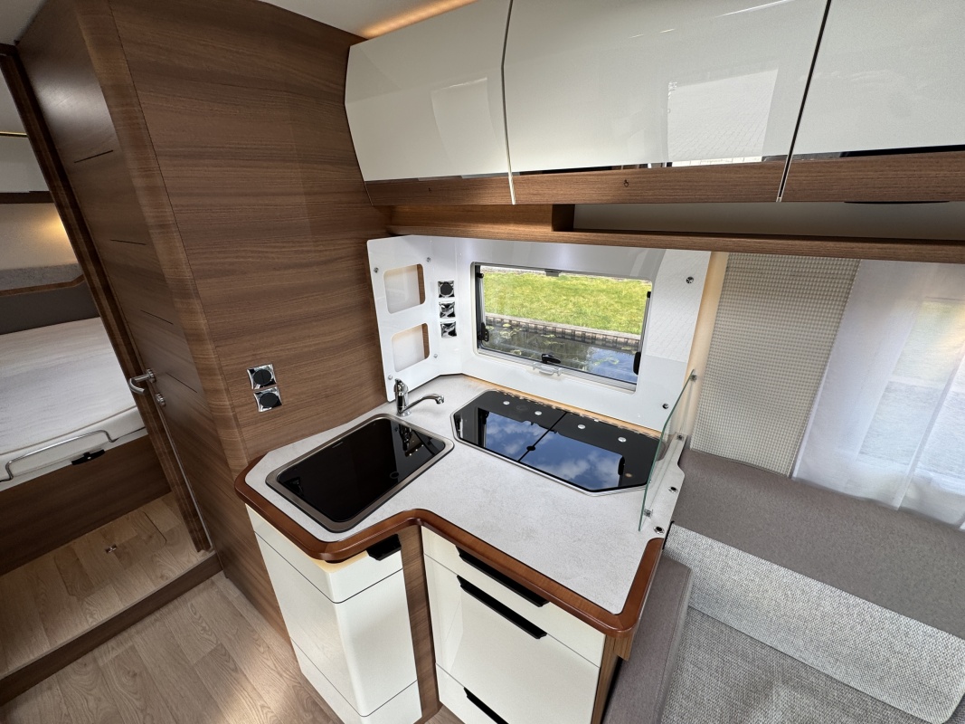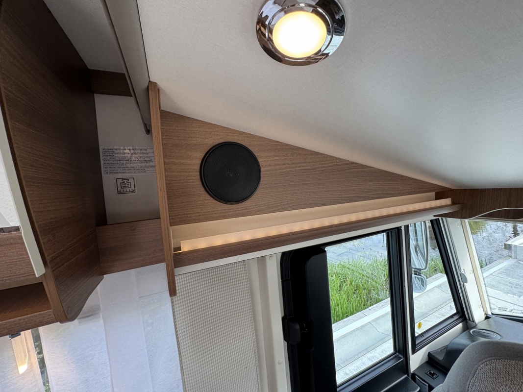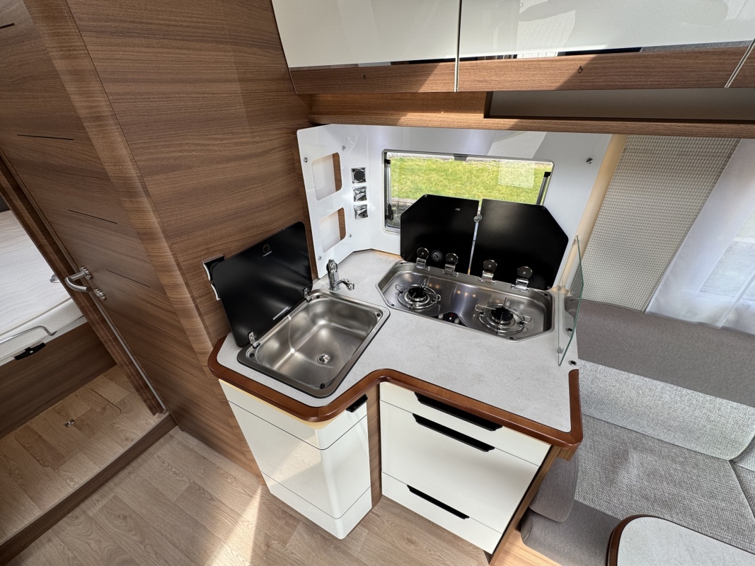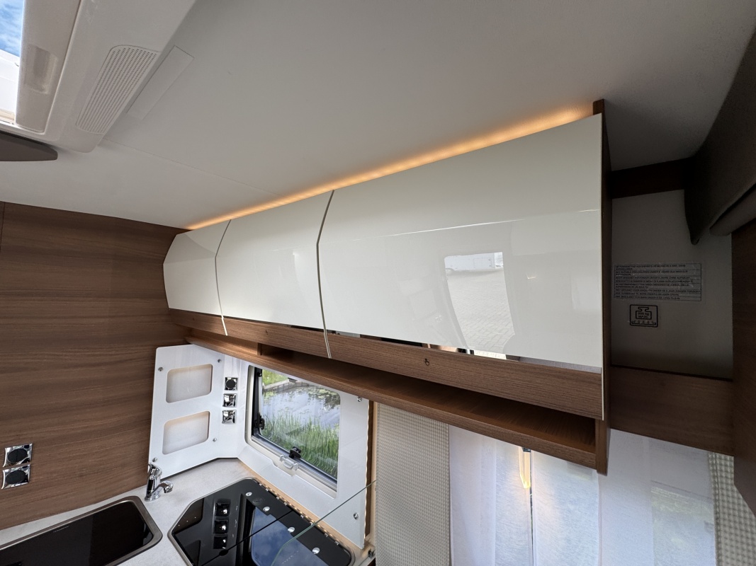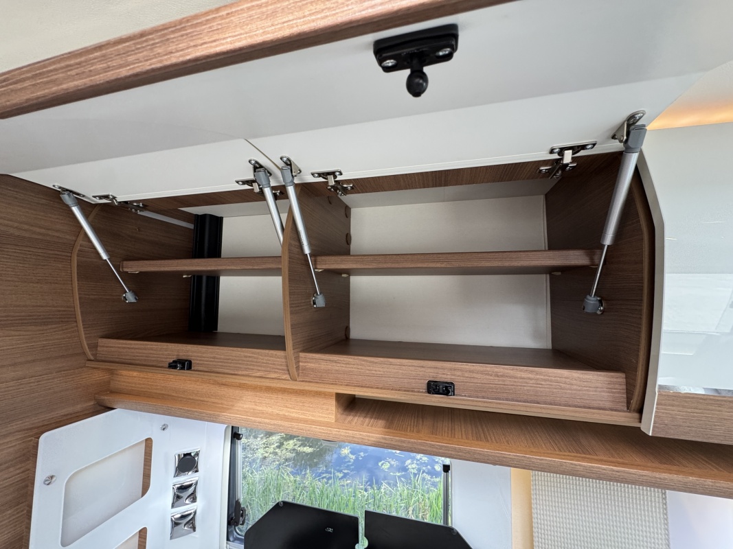 Voorin de cabine staan twee volledig draai- en verstelbare comfortstoelen, daarboven een groot twee persoons hefbed. Een face to face zitgroep waarbij u de voorstoelen kan draaien biedt een enorme ruime en gezellige zitgroep. De tafel in opklap- en volledig verschuif- en draaibaar.
