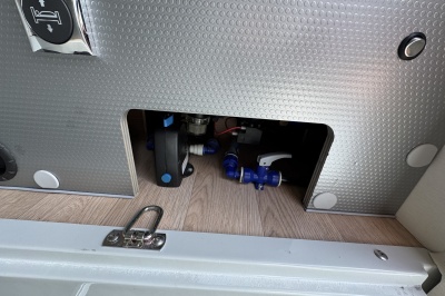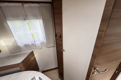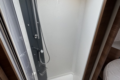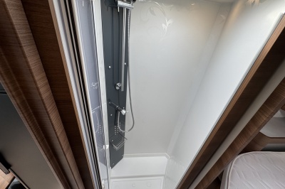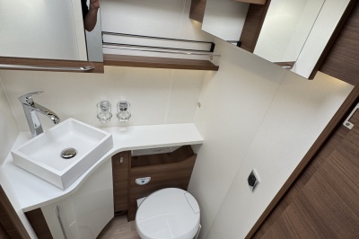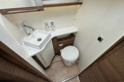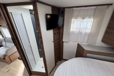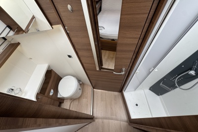 Voor het bed is een ruime aparte douchecabine en aan de andere zijde de toiletruimte met cassettetoilet en een wastafel en toiletkast.