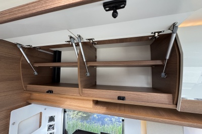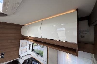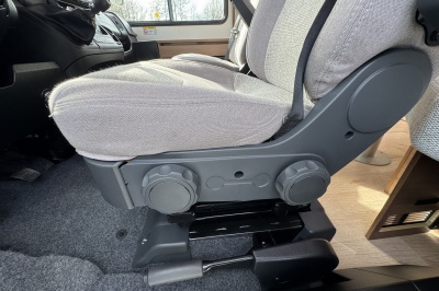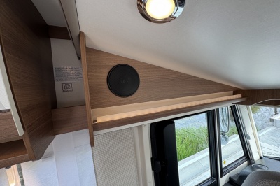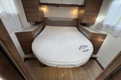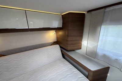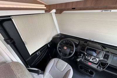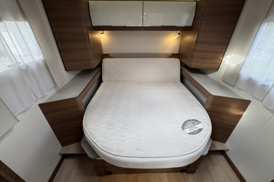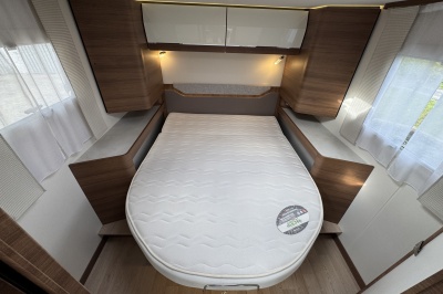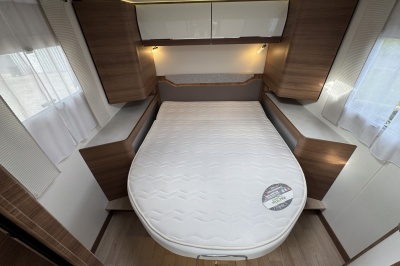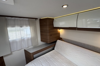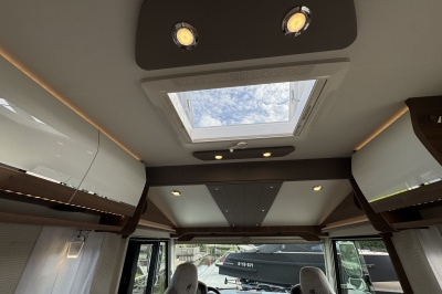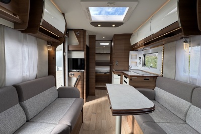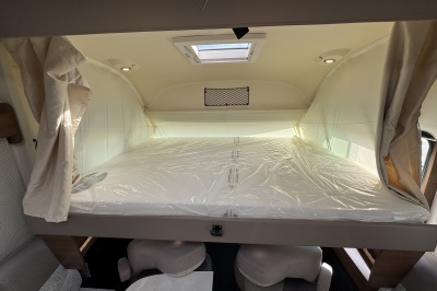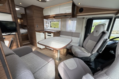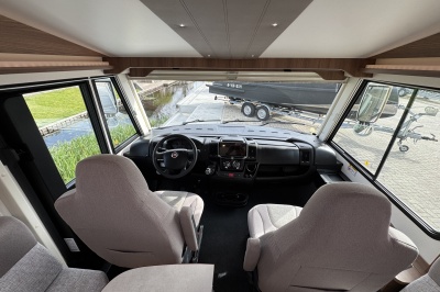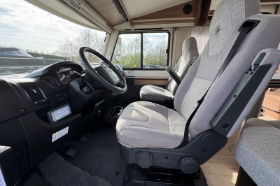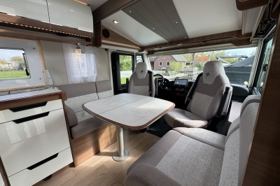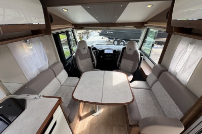Voorin de cabine staan twee volledig draai- en verstelbare comfortstoelen, daarboven een groot twee persoons hefbed. Een face to face zitgroep waarbij u de voorstoelen kan draaien biedt een enorme ruime en gezellige zitgroep. De tafel in opklap- en volledig verschuif- en draaibaar.